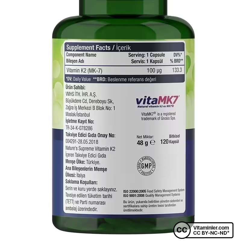 Nature's Supreme Vitamin K2, %100 natürel yöntemler kullanılarak üretilir ve yüksek verimlilikte K2 vitamini desteği sağlar. Her bir kapsülde 100 mcg K2 vitamini içeriği ile yaşamınızın her evresinde kemikleriniz için iyi olan günlük K2 vitamini gereksiniminizi karşılamaya yardımcı olmaktadır. K vitamini normal kemiklerin korunmasına ve normal kan pıhtılaşmasına katkıda bulunmaktadır. Nature's Supreme Vitamin K2 ürününün patentli ham maddesi VitaMK7® markadır. Bu ham maddenin en önemli özellikleri; natürel yöntemlerle üretilen K2 vitamininin aktif izomerleri sayesinde yüksek seviye biyoyararlanım sağlaması ve çok uzun süre dolaşım sisteminde kalabilen bir ham madde olmasıdır.