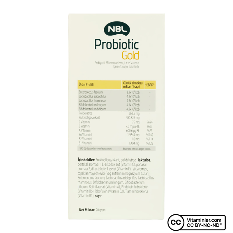 NBL Probiotic Gold, probiyotik mikroorganizma ve vitaminler bulunan takviye gıdadır. Probiyotik mikroorganizmalar sindirim sistemini düzenlemeye ve bağışıklık sistemini desteklemeye yardımcı olur.