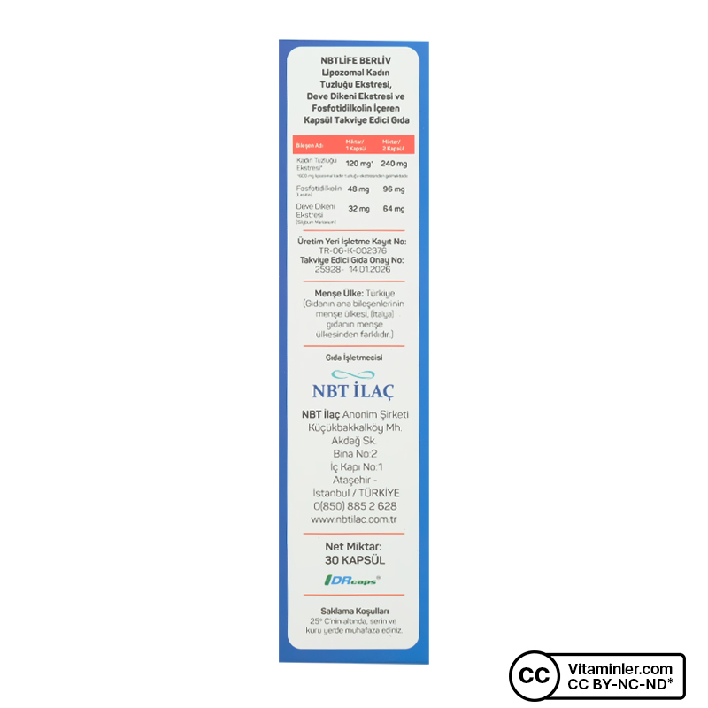 Nbt Life Berliv; her kapsülünde 600 mg Berberis Vulgaris sunan bir gıda takviyesidir. Formülünde ayrıca devedikeni ekstresi ve fosfatidilkolin barındıran gıda takviyesi, lipozomal teknolojisi ile desteklenmiştir. Renklendirici, yapay aroma, tatlandırıcı ve koruyucu içermez. Vegan ve vejetaryen bireylerin kullanımına uygun şekilde geliştirilmiştir.