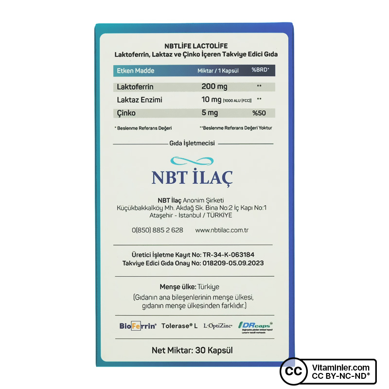 Nbt Life Lactolife 30 Kapsül; patentli Bioferrin® laktoferrin, Tolerase® L laktaz enzimi ve L-Optizinc® çinko içeren özel formüle sahip bir takviye edici gıdadır. Türkiye’nin ilk mikroenkapsüle laktoferrin formu olan Lactolife, laktoferrini laktaz enzimi ile kombine ederek geliştirilmiştir.