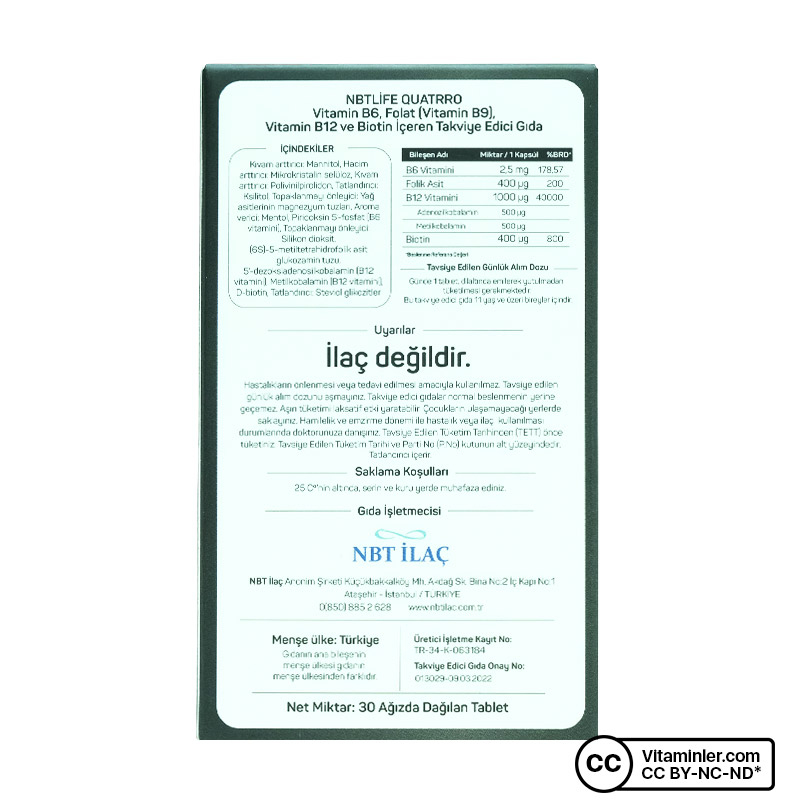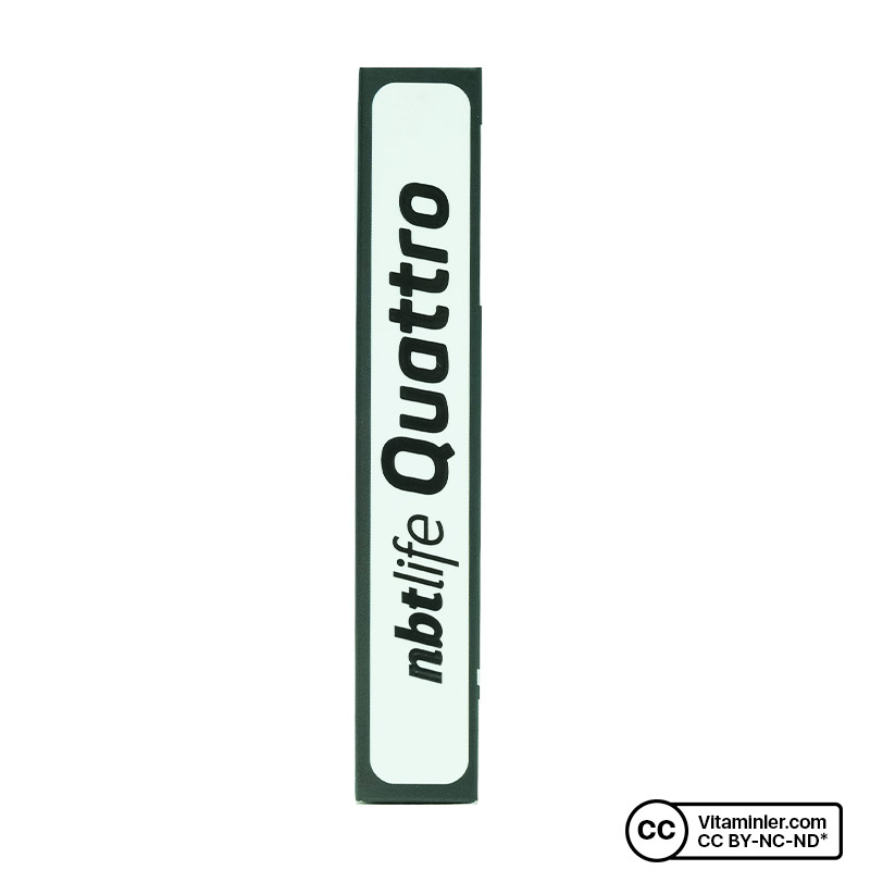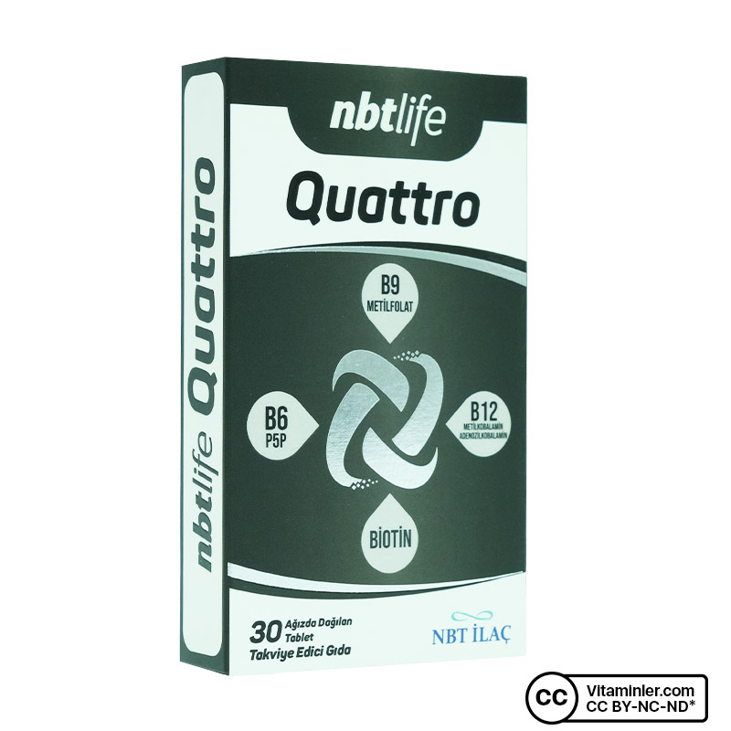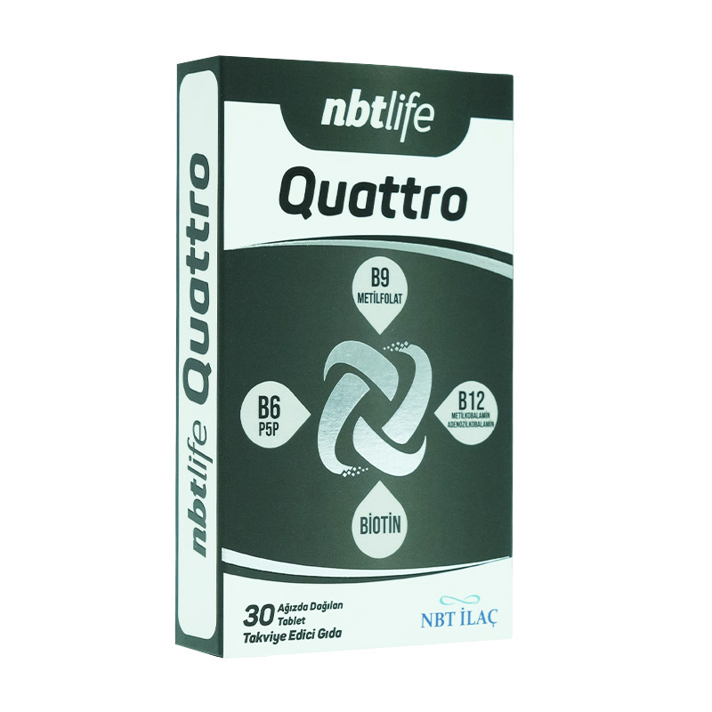 Nbt Life Quatro; B grubu vitaminlerinin aktif formlarını tek bir porsiyonda buluşturan gıda takviyesidir. Formülünde B6 vitamininin aktif formu P5P, B9 vitamininin aktif formu metilfolat, B12 vitamininin aktif formları olan metilkobalamin ve adenozilkobalamin ile biotin yer alır.