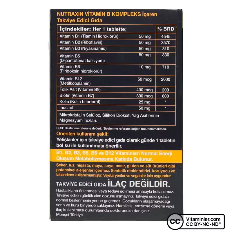 Nutraxin Vitamin B Complex; B1, B2, B3, B5, B6, B12 vitaminleri ile folik asit, biotin, kolin ve inositol içerir. Özel formülünde soya, mısır ve süt ürünleri gibi potansiyel alerjenler bulunmaz. Şeker veya gluten içermeyen formüle sahiptir. Ayrıca 60 kapsülden oluşması sayesinde uzun süreli kullanım imkanı sunar. Yetişkinler için takviye edici gıda olarak günde 1 tabletin bol su ile kullanılması önerilir.