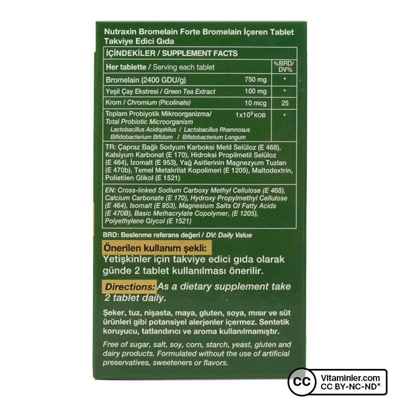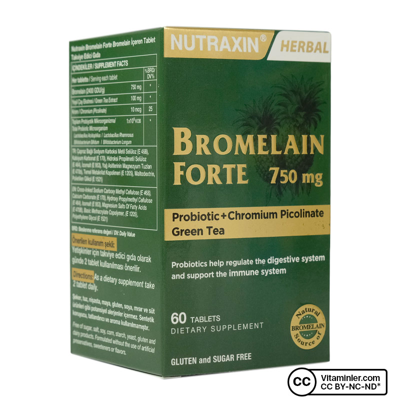 Nutraxin Bromelain Forte, ananastan elde edilen ve proteinleri sindiren bir enzim olan bromelain (2400 GDU/g) içerir. Formülü yeşil çay ekstresi, krom ve probiyotik ile desteklenmiştir. Bu ürün probiyotik mikroorganizma içerir. Probiyotik mikroorganizmalar sindirim sistemini düzenlemeye ve bağışıklık sistemini desteklemeye yardımcı olur.* Krom ise normal kan glukoz düzeyinin korunmasına katkıda bulunur.*