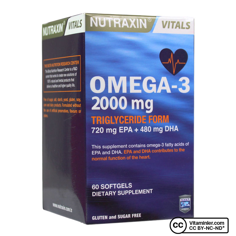 Nutraxin Omega-3 2000 mg ; EPA ve DHA omega-3 yağ asitlerini içeren balık yağıdır. Omega-3 2000 mg , ağır metal içermemektedir. GOED sertifikasına sahiptir. Şeker, nişasta, tuz, maya, gluten, soya, mısır ve süt ürünleri gibi potansiyel alerjenleri içermez. Sentetik renklendirici, tatlandırıcı ve koruyucu kullanılmamaktadır.