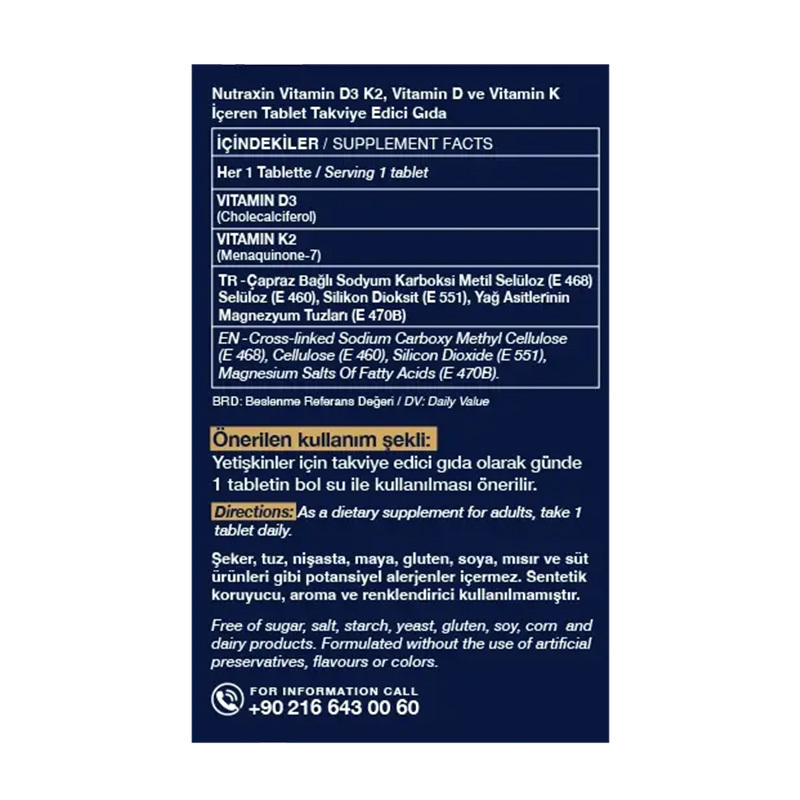 Nutraxin Vitamin D3 K2 30 mL Sprey, her servisinde kolakalsiferol formunda 1000 IU D3 vitamini ve 25 mcg K2 Menakinon-7 formunda K2 vitamini sunar. Bunların yanı sıra içerisinde sentetik renklendirici, tatlandırıcı ve koruyucu bulunmaz. Ayrıca; şeker, nişasta, tuz, maya, gluten, soya, mısır ve süt ürünleri gibi potansiyel alerjenleri içermez.