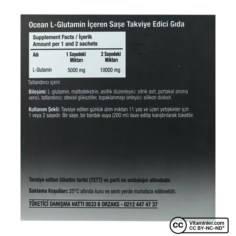 Ocean L-Glutamin, her bir saşede 5000 mg L-Glutamin içerecek şekilde formüle edilmiştir. Saşe formu sayesinde taşıma ve kullanım açısından pratiklik sağlar. Günlük kullanıma uygun olarak hazırlanmış olan ürün, 60 saşelik ambalajı ile sunulmaktadır.