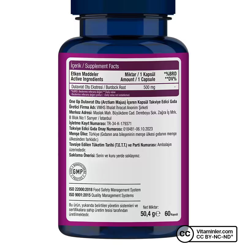 One Up Burdock Root, her kapsülde 500 mg dulavrat otu ekstresi içeren bitkisel bir takviyedir. Dulavrat otu, özellikle Asya kültürlerinde uzun yıllardır bilinen ve geleneksel kullanımıyla öne çıkan bir bitki türüdür. Ürün, katkı maddesi içermeyen formülü, bitkisel kapsül yapısı ve sade içeriğiyle dikkat çeker. Gluten ve tatlandırıcı içermeyen One Up Burdock Root; MP, ISO 9001 ve 22000 gibi kalite standartlarına sahip tesislerde üretilmektedir.