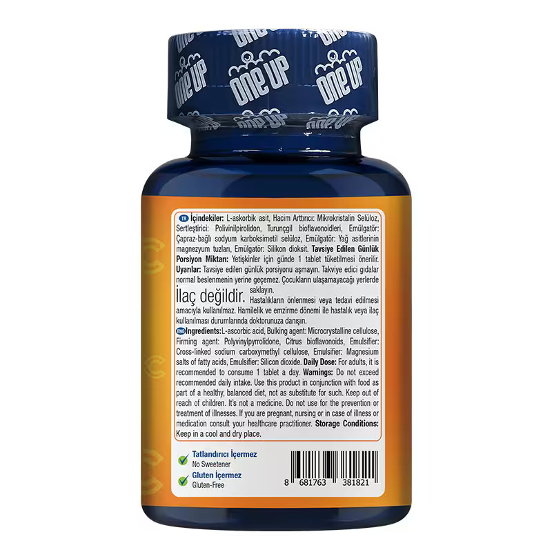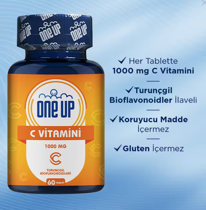 One Up C Vitamini, 1000 mg C vitamini ve 100 mg turunçgil bioflavonoidleri içeren bir C vitamini takviyesidir. C vitamini, insan vücudu tarafından üretilmeyen ve dışarıdan alınması gereken bir vitamindir. One Up C Vitamini 1000 Mg 60 adet tabletten oluşur ve yetişkin kullanımı için uygundur.