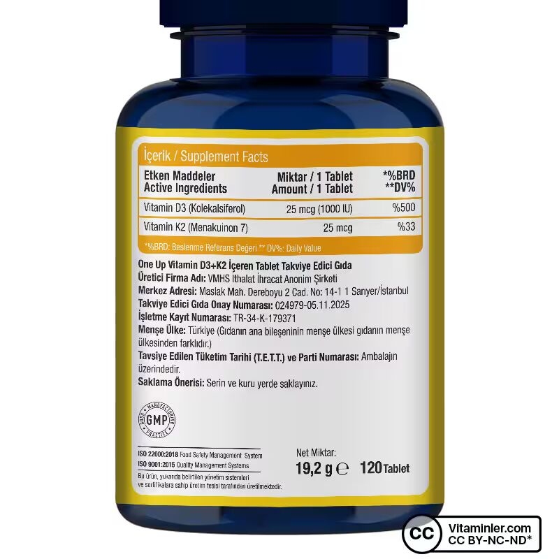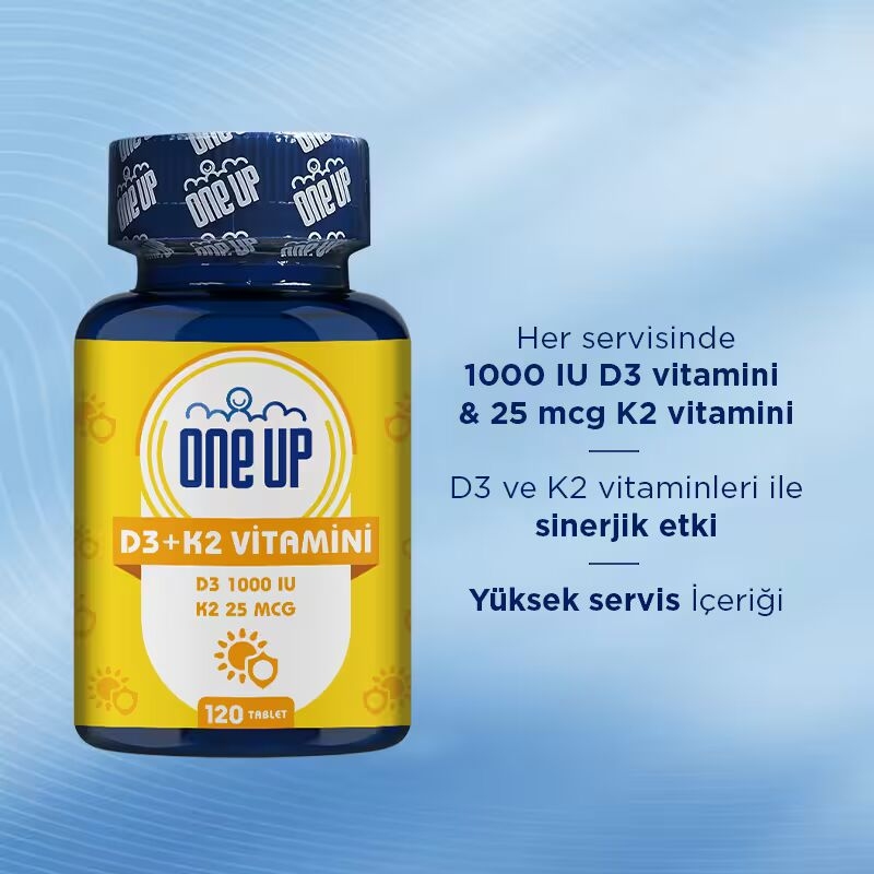 One Up Vitamin D3+K2, her tabletinde 25 mcg D3 vitamini ve 25 mcg K2 vitamini içeren, özenle formüle edilmiş sinerjik bir takviyedir. Servis başına günlük ihtiyacın %500’ünü karşılayan 1000 IU D3 vitamini ve 25 mcg K2 vitamini sağlayan ürün, tablet formu sayesinde kolayca kullanılabilir ve vücutta hızlı emilim gösterir. Tatlandırıcı ve gluten içermeyen formülü vejetaryen kullanım için de uygundur. Yüksek servis içeriğiyle günlük kullanım için pratik bir seçenek olup, dengeli beslenme rutininize kolayca eklenebilir.