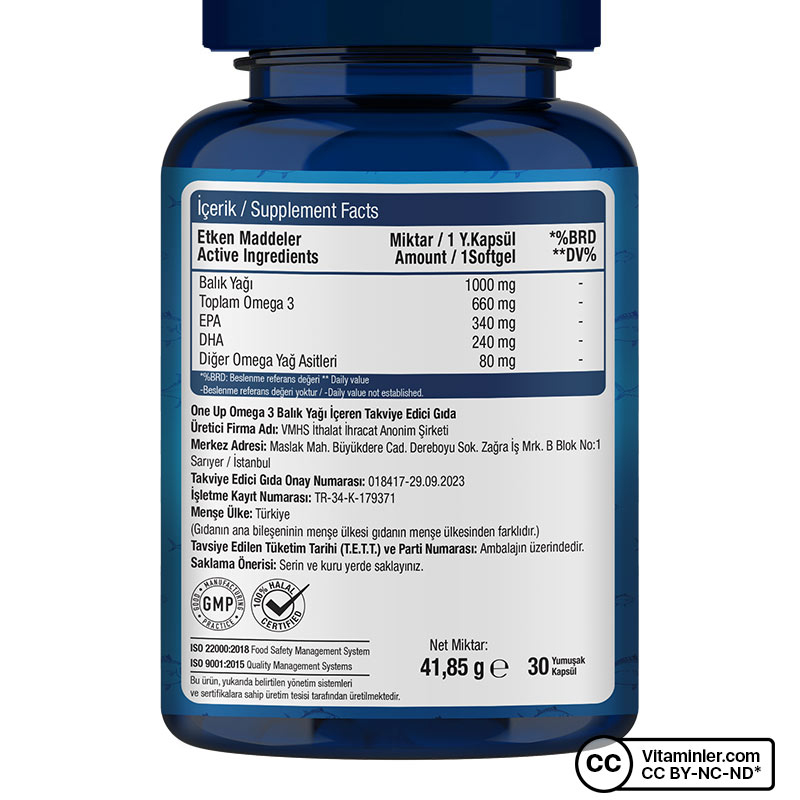 One Up Omega 3 1000 Mg ürünü, yüksek oranda omega 3 yağ asidi sağlayan trigliserid forma sahip balık yağı içerikli besin takviyesidir. Tek bir kapsülde 340 mg EPA ve 240 mg DHA omega 3 yağ asidi bulunmaktadır. ‘EPA ve DHA, kalbin normal fonksiyonuna katkıda bulunur. DHA normal beyin fonksiyonlarının korunmasına katkıda bulunur’*.