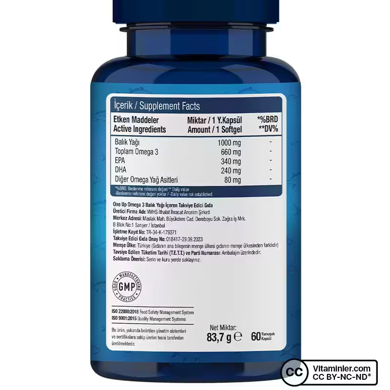One Up Omega 3 1000 Mg, her kapsülde 340 mg EPA (eikosapentaenoik asit) ve 240 mg DHA (dokosahekzaenoik asit) sunar. Trigliserid formda sunulan balık yağı içeriği, yumuşak (softjel) kapsül formu ve limon aroması sayesinde pratik bir kullanım imkanı sunar.