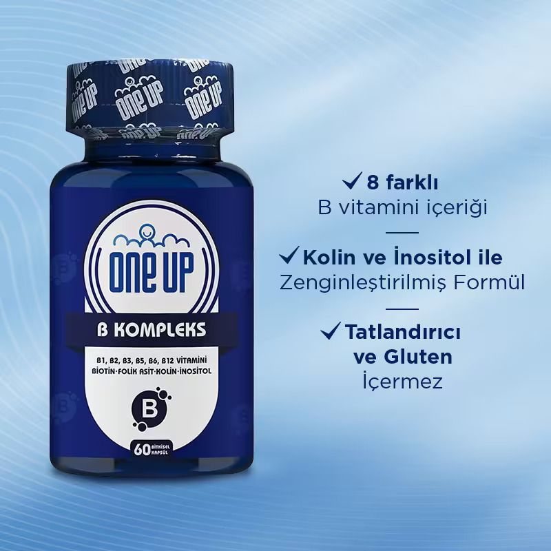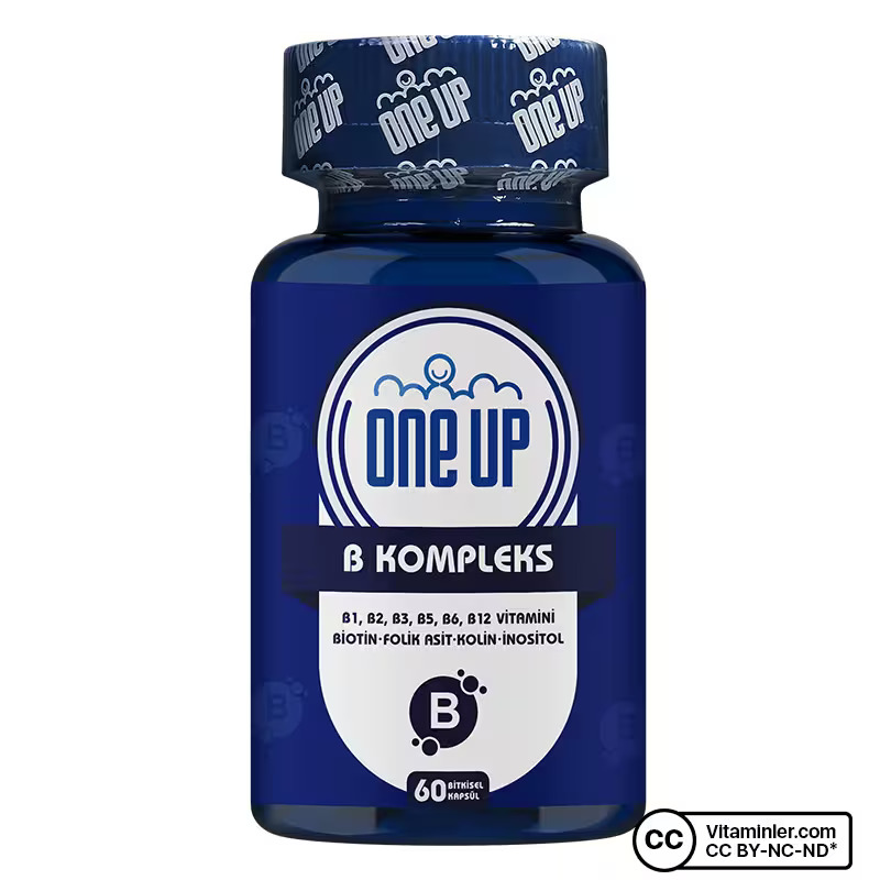 One Up Vitamin B Kompleks, 8 farklı B vitaminini 2 farklı bileşen ile buluşturan bir gıda takviyesi formülüdür. Ürün içeriğinde B1 (Tiamin), B2 (Riboflavin), B3 (Niasin), B5 (Pantotenik Asit), B6 (Piridoksin), B7 (Biotin), B9 (Folik Asit), B12 (Metilkobalamin) vitaminleri bulunmaktadır. Ürünün bu bileşenleri kolin ve inositol ile desteklenmiştir.