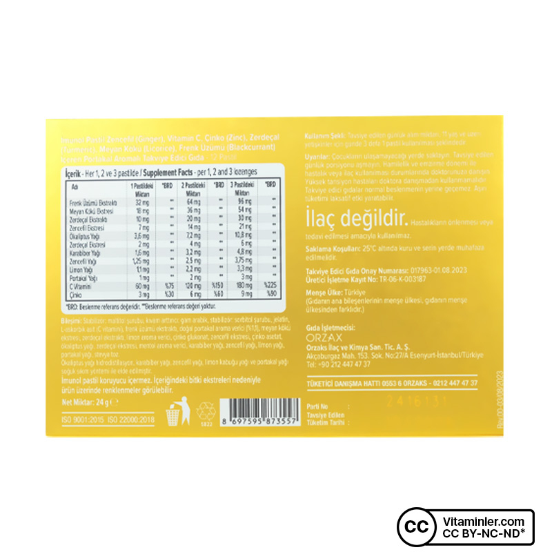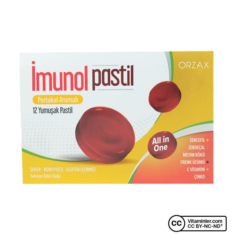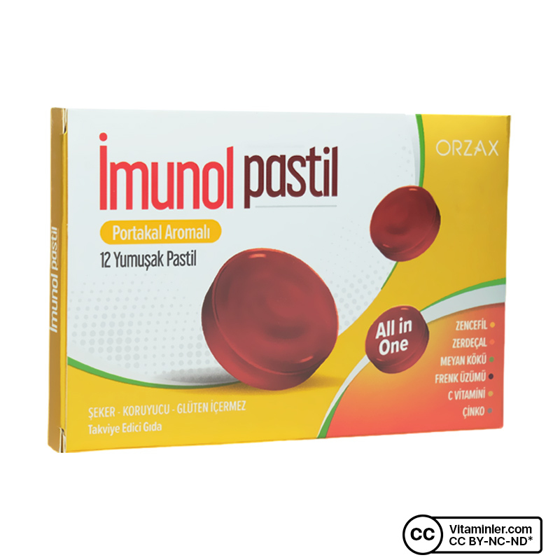 Orzax Imunol 12 Pastil Portakal; zencefil, zerdeçal, meyan kökü, frenk üzümü ekstreleri ile C vitamini ve çinko içeren takviye edici gıdadır. Portakal aroması ile yumuşak pastil formda sunulmaktadır.