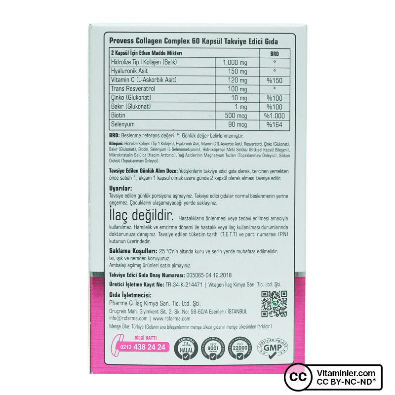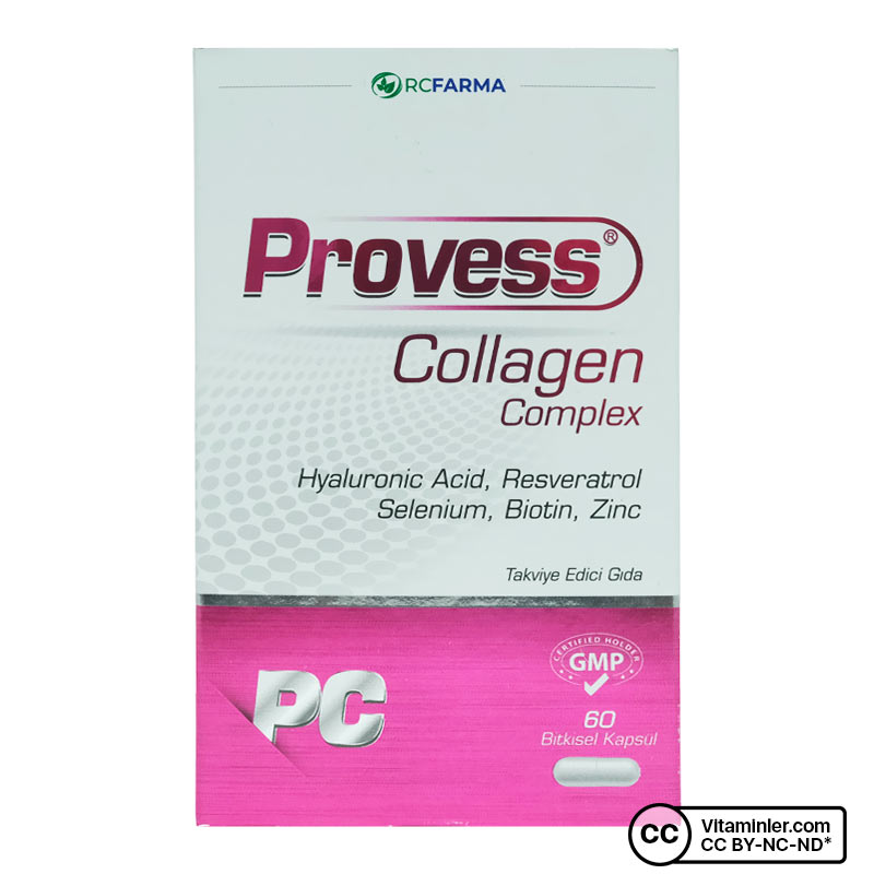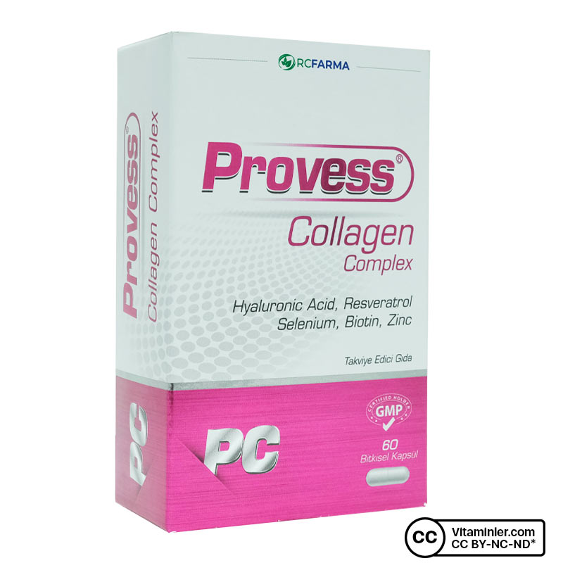 PharmaQ Provess Collagen Complex içeriğinde doğası değiştirilmiş hidrolize balık kolajeni ve hyaluronik asit bulunduran takviye edici gıdadır. Bunun yanı sıra resveratrol, c vitamini, çinko, bakır, biotin ve selenyum içeriği ile ürün desteklenmiştir.