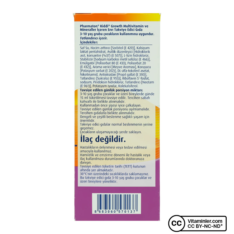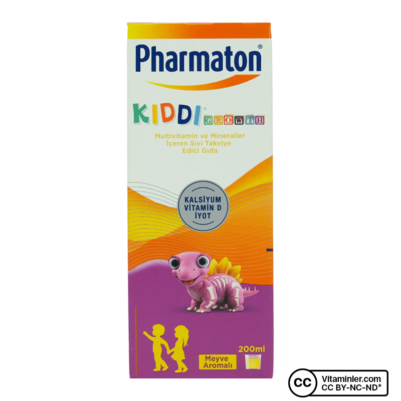 Pharmaton® Kiddi Growth, çocukların kullanımı için tasarlanmış sıvı formda bir takviye edici gıdadır. İçeriğinde L-lizin, kalsiyum, iyot ve 5 farklı vitamin bir arada bulunur. Karışık meyve aroması sayesinde günlük kullanıma uygun şekilde tasarlanmıştır. Ürün, özellikle 3–10 yaş grubu çocuklar ve üzeribireyler için kullanılmak üzere üretilmiştir.