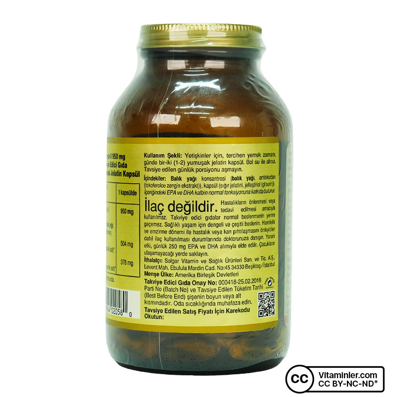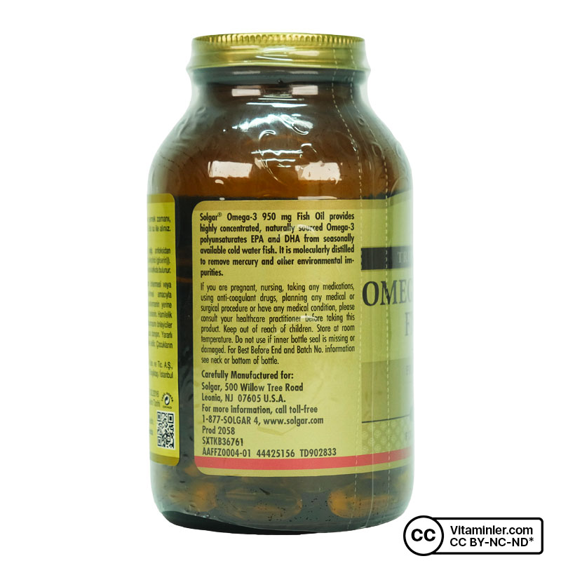 Solgar'ın en yüksek Omega 3 yağ asitleri içeren takviye edici gıdasıdır. Her kapsülünde Ham maddesini soğuk su balıklarından elde eden Solgar Omega 3, her kapsülünde 1,4 gram balık yağı konsantresi ve bundan gelen 950 mg Omega 3 yağ asidi içermektedir. Vücutta üretilemeyip, dışarıdan besinler yoluyla ya da takviyelerle alınması gereken Omega 3'ün, araştırmalar sonucunda kalp sağlığına olumlu sonuçları olduğu görülmüştür.