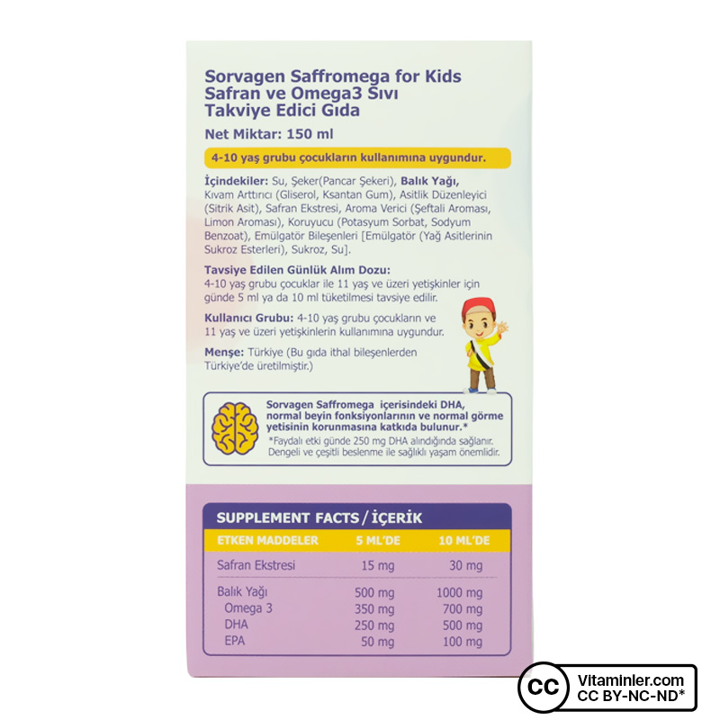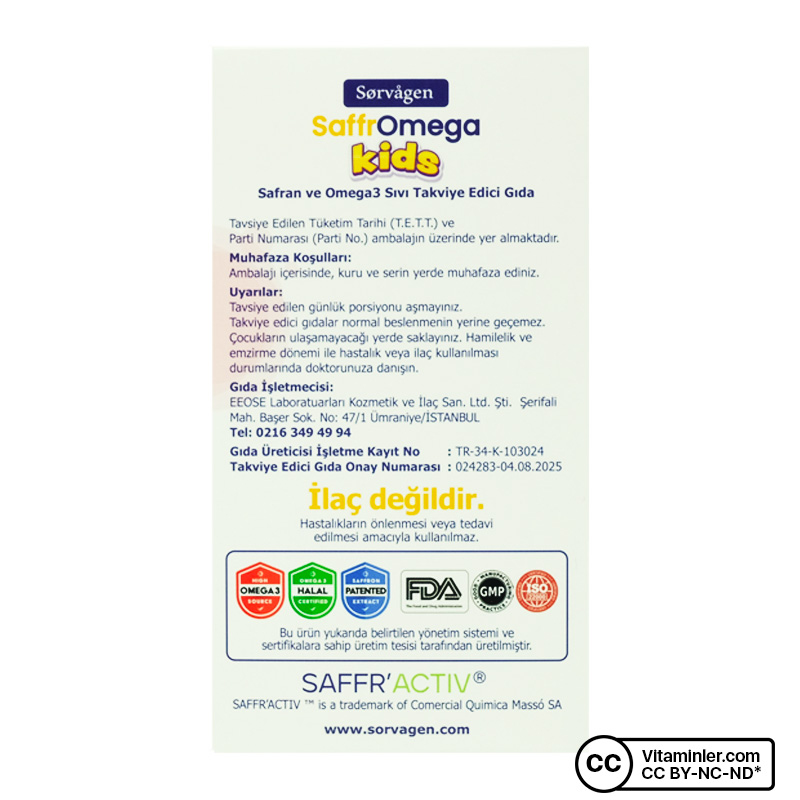 Sorvagen SaffrOmega, safran ve 3 desteği sunan bir gıda takviyesidir. Servis başına ideal DHA ve EPA oranlarına sahip 500 mg değerinde balık yağı içeren ürün, aynı zamanda 15 mg’lık patentli safran ekstresi ile desteklenmiştir. Patentli Safran Ekstresi: Saffr’Activ İçeriğinin %10’nu, Safran çiçeğinden (Crocus sativus L.) gelen Krosin, Pikrokrosin, Krosetin, Safranal, Kaempferol, Kuersetin gibi 33’ten fazla biyoaktif bileşenden oluşur. Sıvı formu ve şeftali aroması ile kullanım kolaylığı sağlar.
