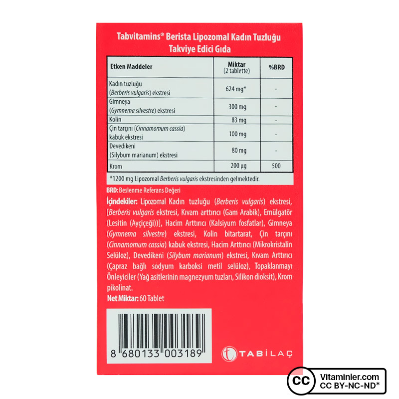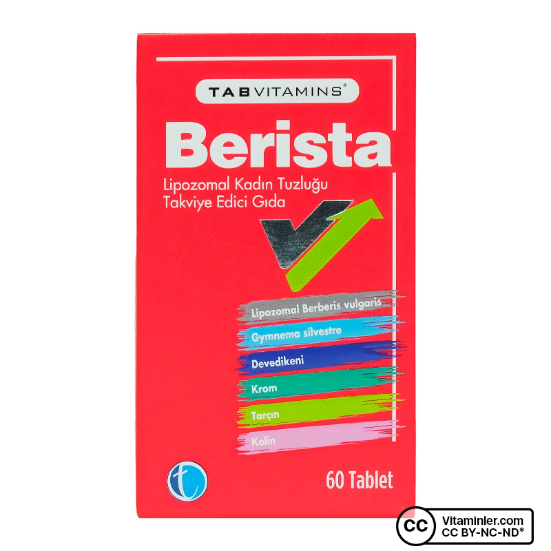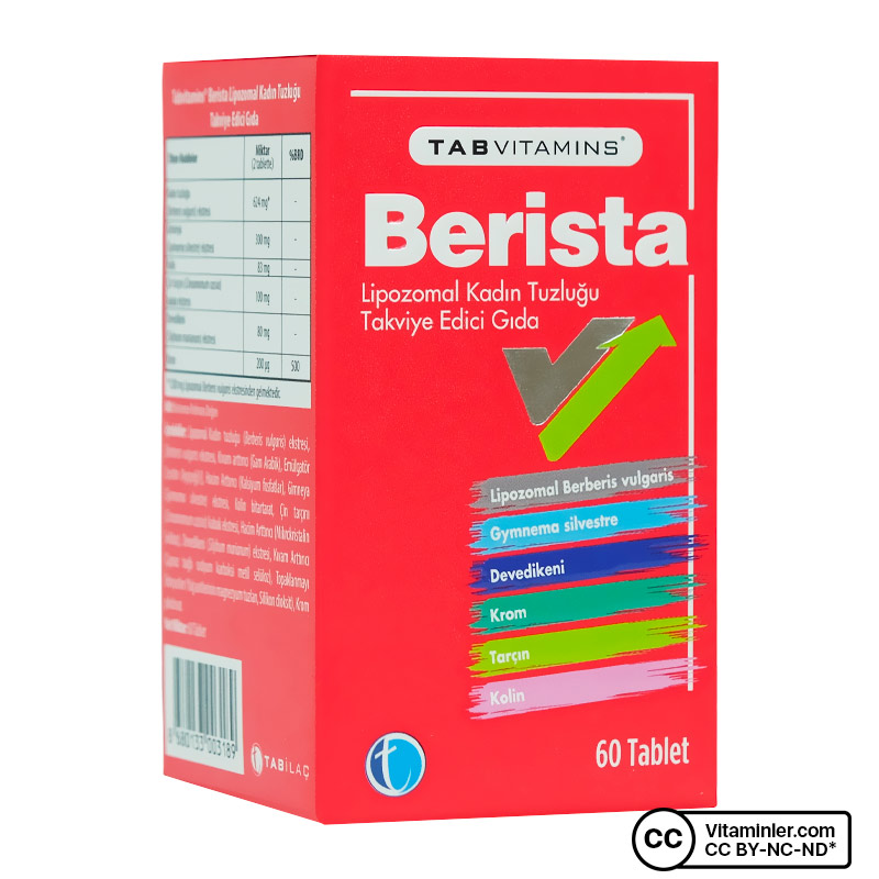 TabVitamins Berista, her serviste 624 mg berberis vulgaris bileşeni sunar. Formülünde ek olarak krom ve kolin de içerir. Bunlara ek olarak deve dikeni,çin tarçını gibi bitkisel ekstrelerle desteklenmiştir.
