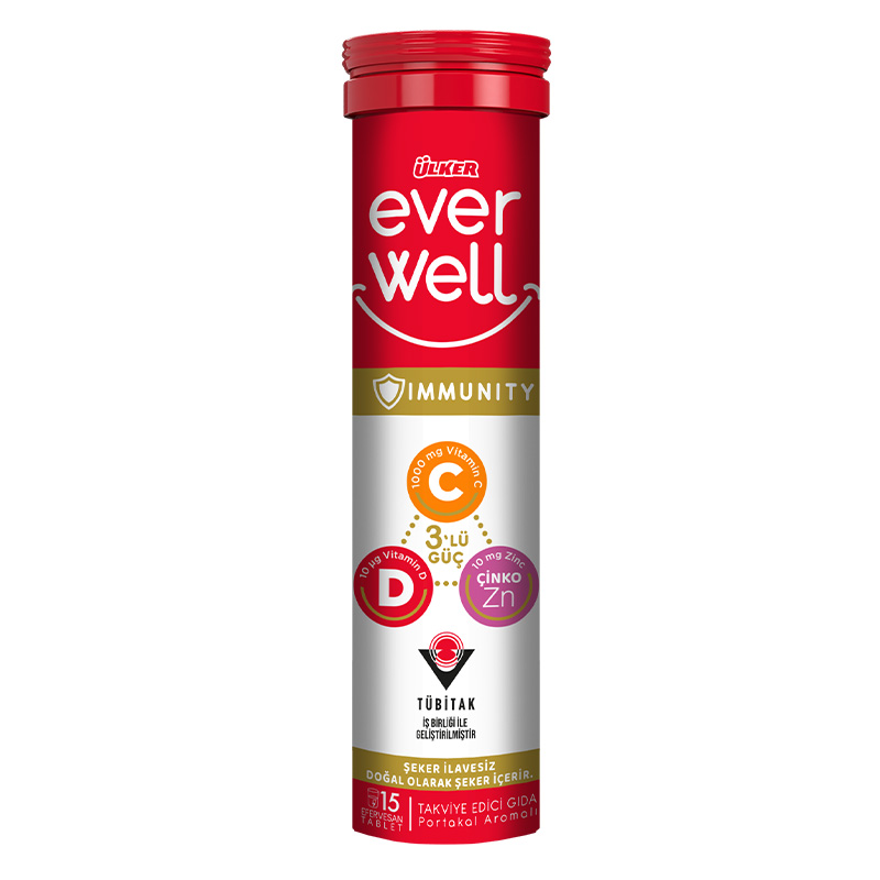 Ülker EverWell C-D-Çinko-Aserola 15 Efervesan Tablet Portakal, her bir efervesan tablette C vitamini, D vitamini ve çinko içeren takviye edici bir gıdadır. Aynı zamanda aserola meyvesi ekstresi ile zenginleştirilmiş formüle sahiptir. Portakal aromalı efervesan formu ile pratik bir kullanım sunar. TÜBİTAK işbirliği ile geliştirilmiştir.