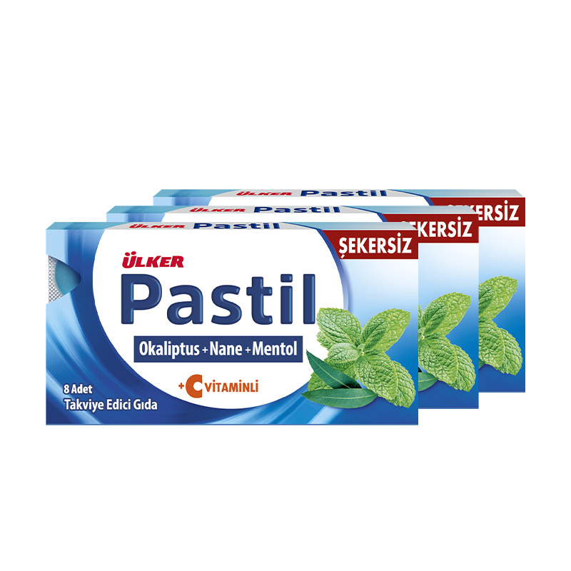 Ülker Pastil Okaliptus Mentol Nane 8 Pastil; her bir pastilde nane ekstresi, okaliptus yağı ve levomentol içeren, C vitamini ile desteklenmiş pastil formunda bir üründür. Şekersiz bir formüle sahiptir. Pastil formu sayesinde pratik bir kullanım imkanı sunmaktadır.
