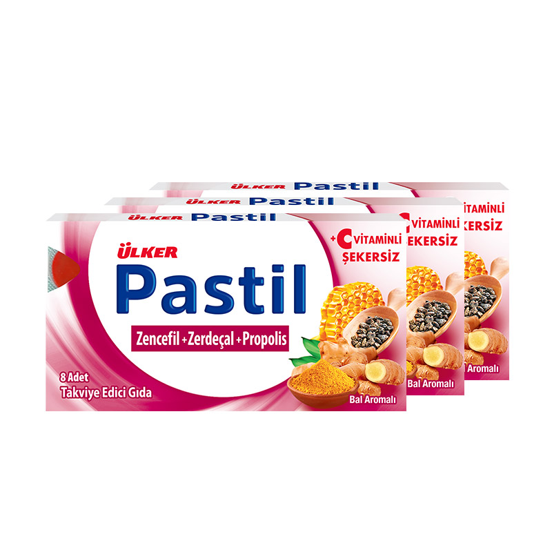 Ülker Pastil Zencefil Zerdeçal Propolis 8 Pastil; her bir pastilde zencefil ve zerdeçal ekstreleri ile birlikte saf propolis ve C vitamini içeren pastil formunda bir üründür. Şekersiz bir formüle sahiptir. Pastil formu sayesinde pratik bir kullanım sunmaktadır.