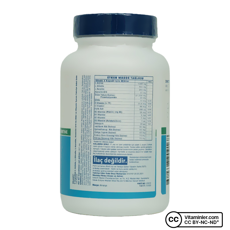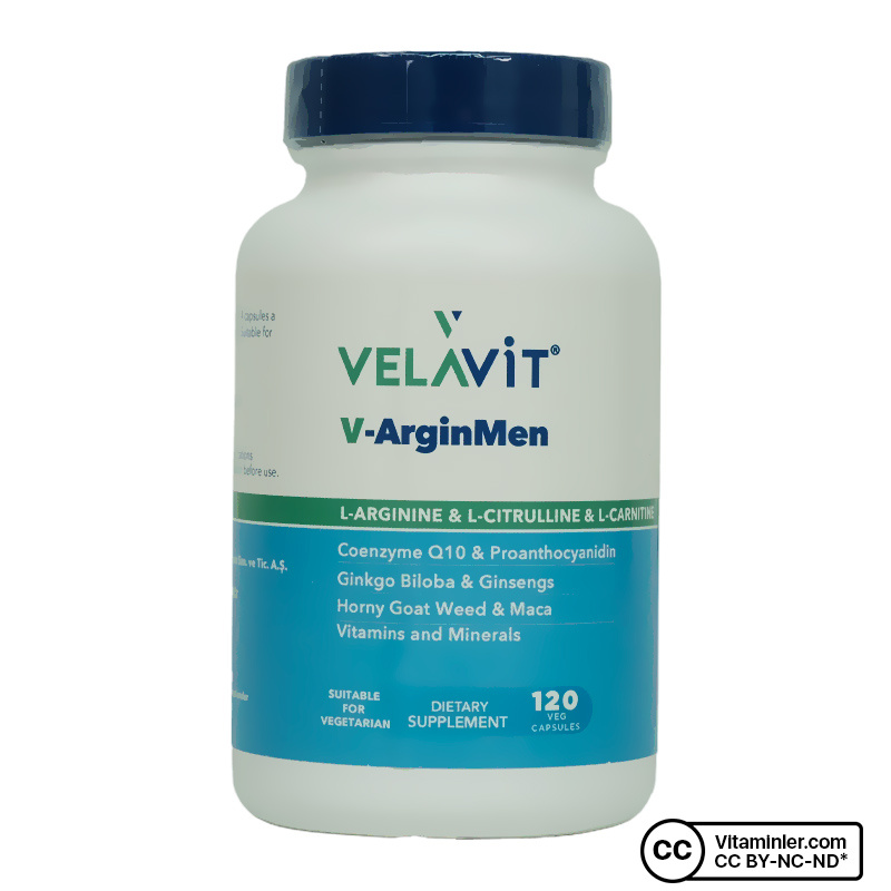 Velavit V-Arginmen 120 Kapsül; L-arjinin, L-sitrulin ve L-karnitin amino asitlerini bir araya getiren formülüyle öne çıkar. İçeriğinde koenzim Q10 ve proantosiyanidin gibi bileşenlerin yanı sıra horny goat weed, maca, ginkgo biloba ve ginseng bitkileri bulunur. E vitamini, D3 vitamini, selenyum, çinko ve folik asit dahil B vitaminleriyle günlük vitamin–mineral çeşitliliği sunan ürün, şeker, gluten, laktoz, süt ürünleri, maya ve yapay aroma içermez. Vejetaryen tüketimine uygundur.