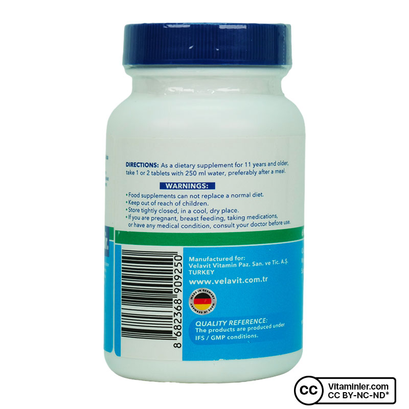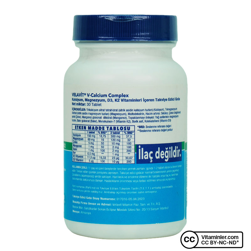Velavit V-Calcium Complex 30 Tablet, her tablette 60 mg magnezyum ve 150 mg kalsiyum ve farklı mineraller içeren özel formülüyle öne çıkar. Minerallerin sitrat formu sayesinde emilim avantajı sunar. D3 ve K2 vitaminleri ile desteklenmiştir. Şeker, gluten, soya, laktoz, süt ürünleri, maya ve yapay aroma içermeyen yapısıyla güvenle tercih edilebilir. Vegan tüketime de uygundur.