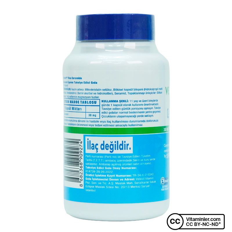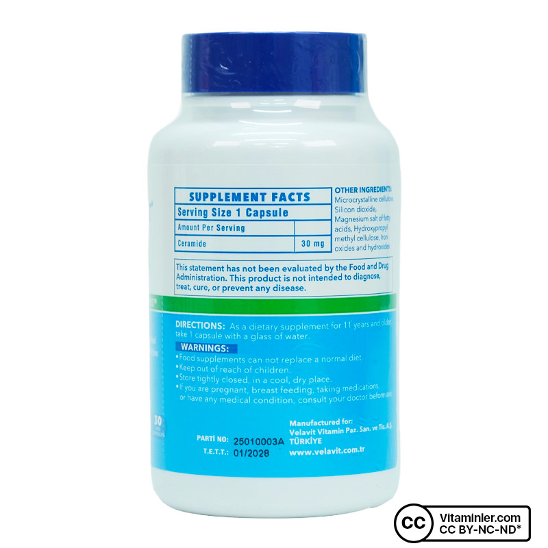 Velavit V-Ceramide her serviste 30 mg Seramid maddesi içerir. Seramid maddesi Seppic firmasından temin edilen patentli bir bileşiktir. Ceramosides patentli ham madde kompleksi kullanılmıştır. Ceramosides buğdaydan gelen en güçlü fitoseramid kaynağıdır. Velavit V-Ceramide, vegan kullanıma uygundur.