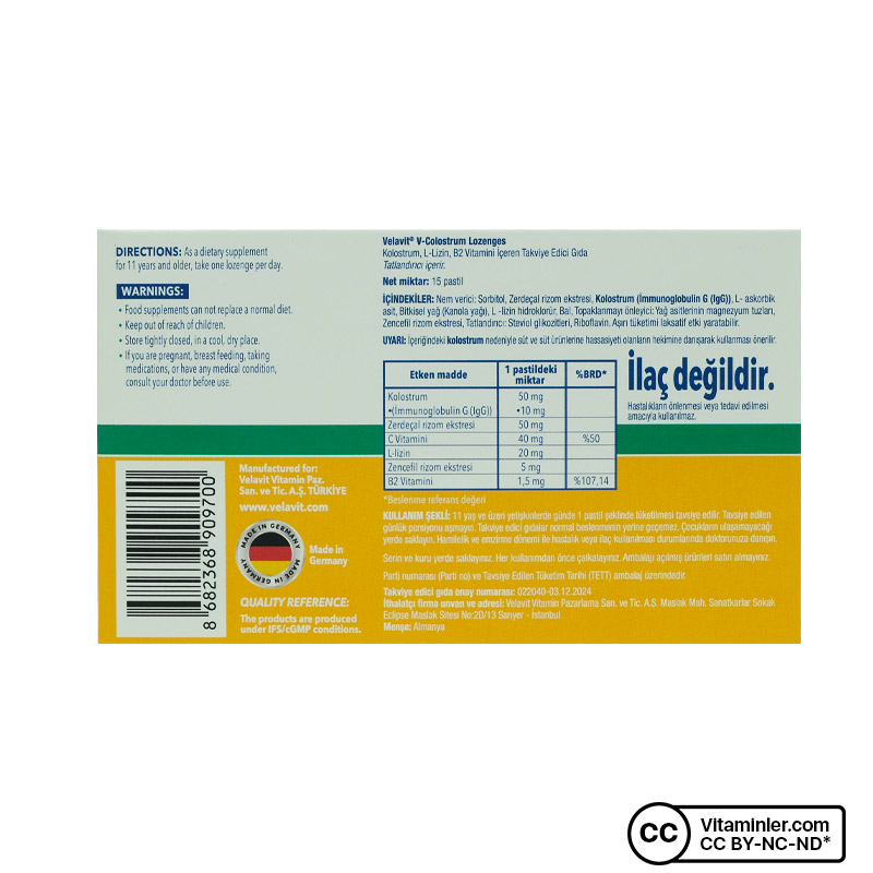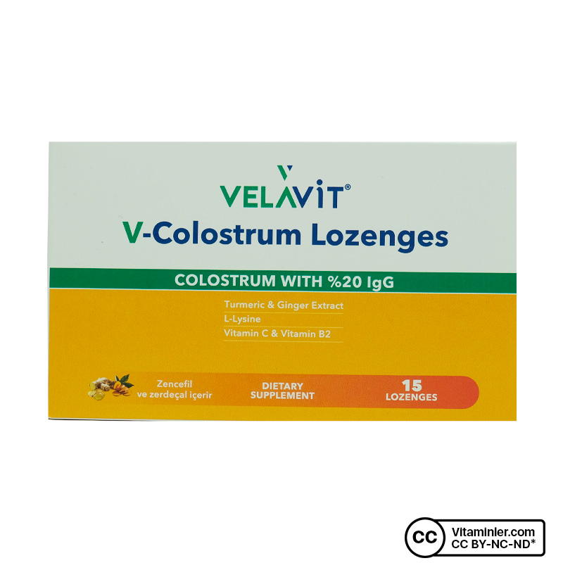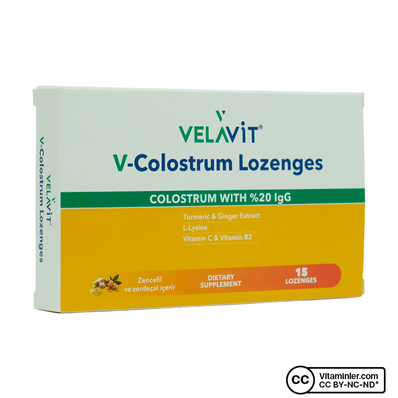 V-Colostrum Lozenges 15 Pastil; L-lizin, B2 ve C vitamini desteğinin yanı sıra yüksek miktarda (%20 IgG standardize) kolostrum içeren zengin bir formüle sahiptir. Zerdeçal (kurkuminoidler) ve zencefil ile zenginleştirilen içerik, 6 özel bileşenin bir araya getirildiği pastil formunda sunulur.