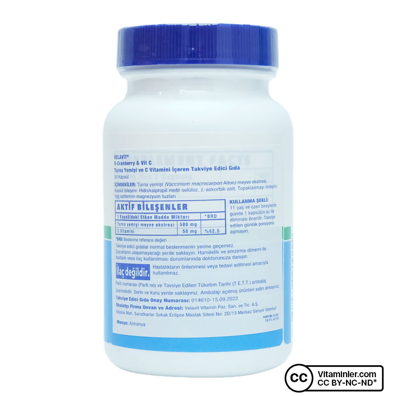 Velavit V-Cranberry Vitamin C 30 Kapsül, turna yemişi meyve ekstresi ile C vitaminini bir araya getiren özel formülüyle öne çıkar. Gluten, laktoz, nişasta, süt ve süt ürünleri içermeyen yapısı sayesinde geniş bir kullanıcı kitlesine hitap eder. Ayrıca vegan tüketime uygun kapsül formu, ürünü günlük kullanım için pratik ve tercih edilebilir bir seçenek haline getirir.