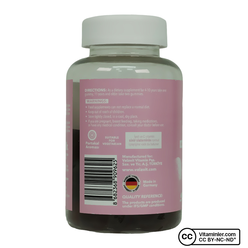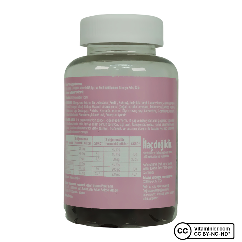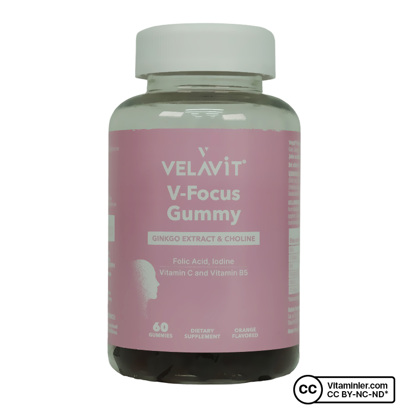 Velavit V-Focus Gummy 60 Çiğnenebilir Form Portakal, ginkgo biloba ekstresi içeren formüle sahiptir. Çocuk ve yetişkin kullanımına uygun olan V-Focus Gummy, portakal aroması sayesinde kolay tüketim imkanı sunar. Gluten, soya ve laktoz içermeyen ürün, 60 adet çiğnenebilir formdan oluşur.