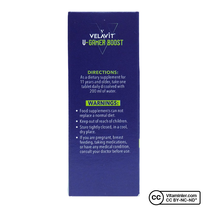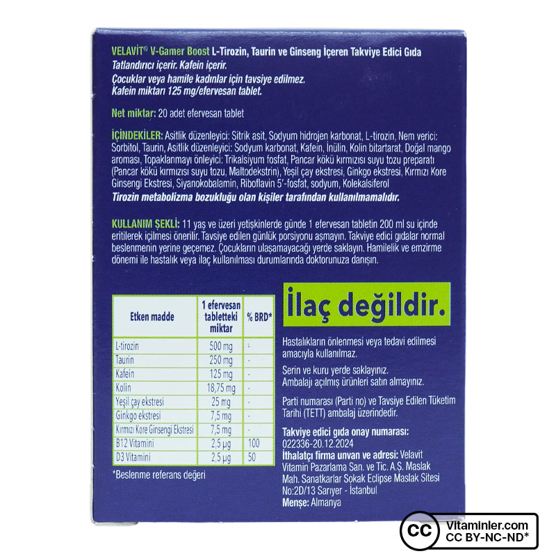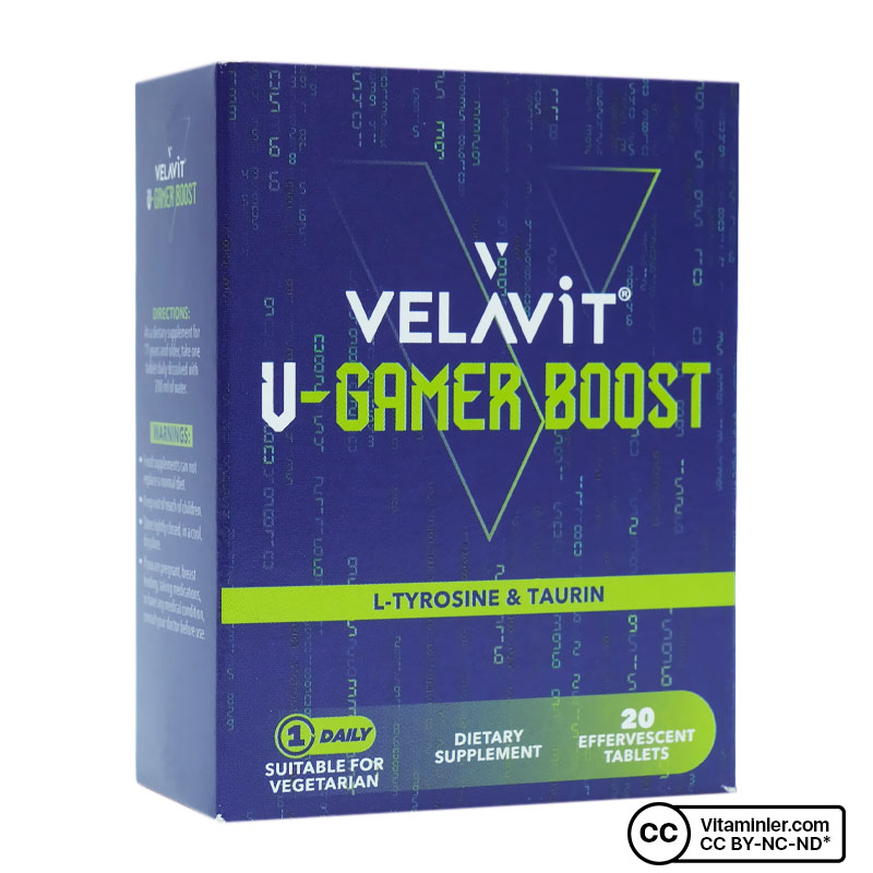 Velavit V-Gamer Boost 20 Efervesan Tablet Mango, yoğun antrenman veya gerektiren anlar için özel olarak formüle edilmiştir. Her tablette L-tirozin, taurin ve kafein içeriğinin yanı sıra bitkisel ekstreler ve vitaminlerle desteklenmiştir. Mango aromalı efervesan formu sayesinde hızlı emilim ve pratik kullanım avantajı sunar. Şeker içermeyen yapısı ve 20 tabletlik kutu formatıyla günlük rutine kolayca dahil edilebilecek bir takviye alternatifi sağlar.