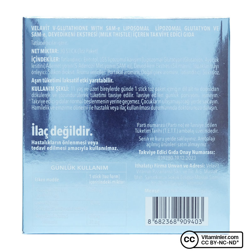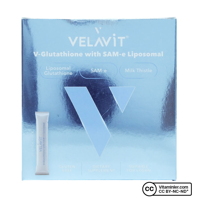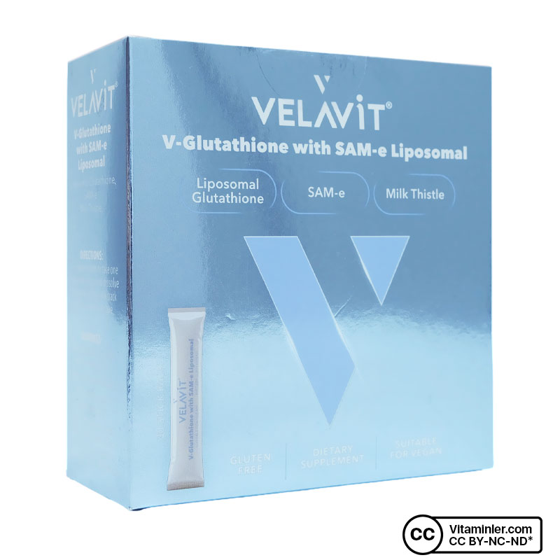 Velavit V-Glutathione with SAM-e Liposomal 30 Saşe Çilek-Portakal, lipozomal formda glutatyon ve SAM-e içeriğiyle öne çıkan özel bir takviyedir. Formülünde ayrıca devedikeni ekstresi (Milk Thistle) bulunur. Doğal portakal ve çilek aroması sayesinde kolay ve keyifli bir kullanım sunar. Velavit Longevity Serisi’nin bir ürünü olan bu takviye, soya, maya, süt ürünleri, şeker ve GDO’lu bileşenler içermez. Vegan tüketime uygun yapısıyla günlük rutine pratik şekilde dahil edilebilir.