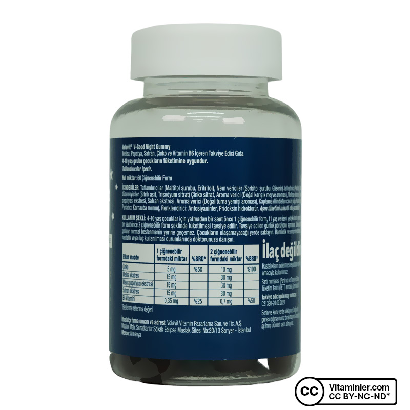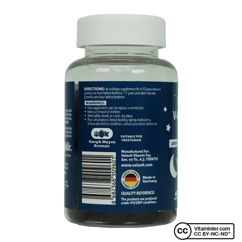 Velavit V-Good Night Gummy 60 Çiğnenebilir Form; melisa, papatya, safran, çinko ve B6 vitamini içeren formülüyle hazırlanmıştır. Karışık meyve aroması sayesinde kullanımı kolaydır. Gluten, soya ve laktoz içermeyen ürün, çiğnenebilir formunu pektin ile elde edilmiş yapısıyla sunar.
