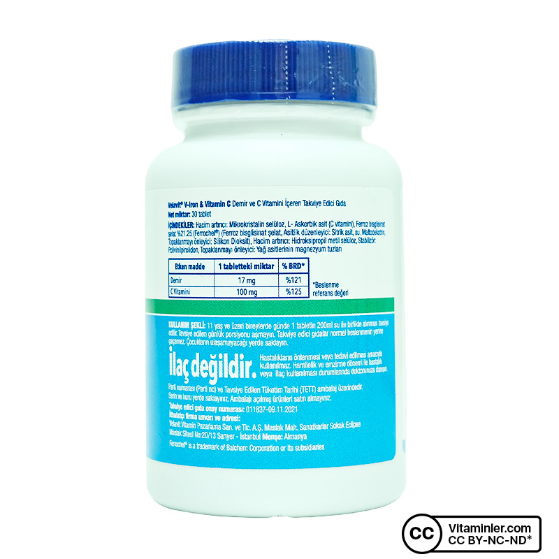 Velavit V-Iron Vitamin C , birbirlerini destekleyen ve güçlendiren demir ile C vitamininin sinerjik etkisinden yararlanılarak oluşturulmuş bir gıda takviyesidir. Her kapsül başına 17 mg demir sunan ürün günlük ihtiyacın tamamından fazlasını karşılarken, 100 mg’lık C vitamini içerir. İçeriğindeki demir ,Patentli Ferrochel® demir bisglisinat formundadır. Gluten, s¸eker, laktoz, süt, maya ve nis¸asta içermez. Vegan kullanımına uygundur.