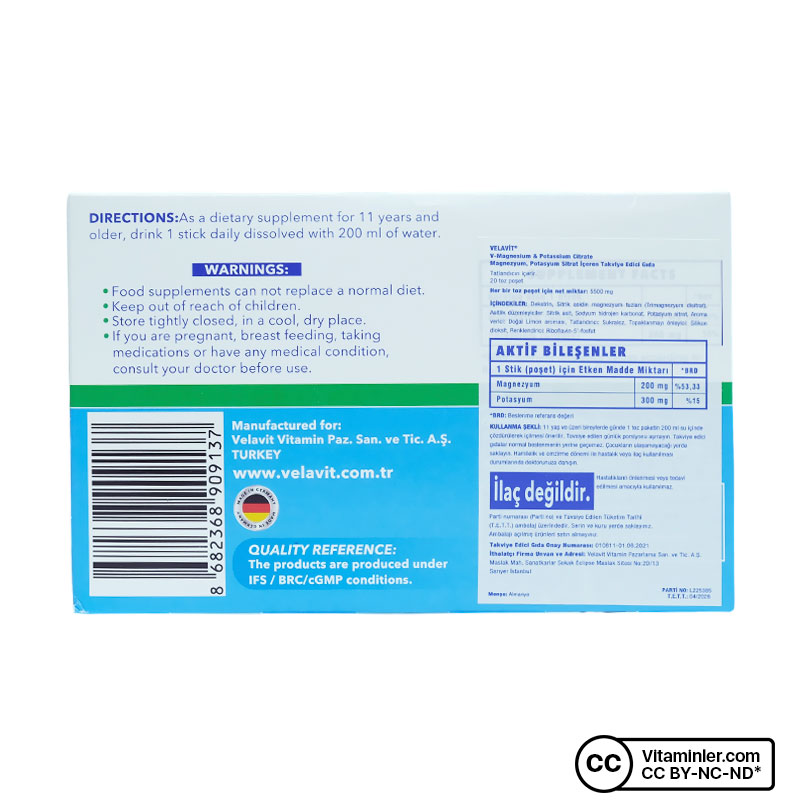 Velavit V-Magnesium & Potassium Citrate 20 Saşe Limon, her saşede 200 mg magnezyum ve 300 mg potasyum içeren özel formülüyle öne çıkar. Minerallerin sitrat formu sayesinde emilim avantajı sunar. Şeker, gluten, soya, laktoz, süt ürünleri, maya ve yapay aroma içermeyen yapısıyla güvenle tercih edilebilir. Doğal limon aromasıyla ferah bir kullanım sağlayan ürün, vegan tüketime de uygundur.