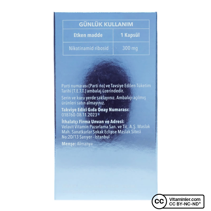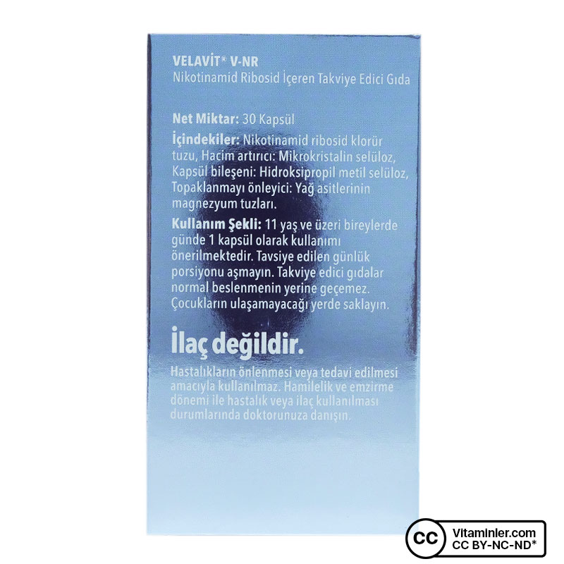 Velavit V-NR Nicotinamide Riboside 30 Kapsül, etkili bir NAD öncülü olan Niagen patentli bileşen ile formüle edilmiş özel bir üründür. Açılımı “Nicotinamide-D Riboside Chloride” olan bu içerik, güvenilirliğiyle öne çıkar. Soya, maya, süt ürünleri, GDO bileşenler ve şeker içermeyen yapısı sayesinde geniş bir kullanıcı kitlesine hitap eder. Ayrıca vegan tüketime uygun formu ile günlük rutine kolayca dahil edilebilecek pratik bir takviye seçeneği sunar.