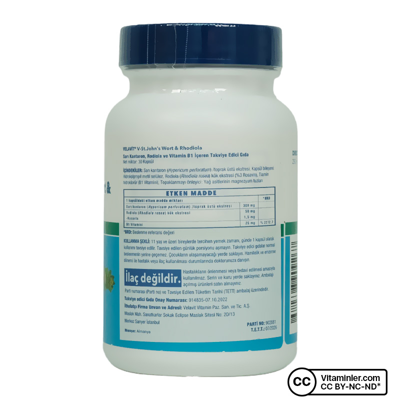 Velavit V-St. John’s Wort & Rhodiola; sarı kantaron, rhodiola ve B1 vitamini içeren özel formüle sahip bir gıda takviyesidir. İçeriğinde yer alan sarı kantaron; Kuzey Amerika, Güney Afrika ve Avustralya gibi farklı coğrafyalarda yetişen bir bitki olarak bilinir. Rhodiola “altın kök” adıyla anılan ve özellikle Avrupa ile Asya’nın dağlık bölgelerinde yetişen bir bitki türüdür. Formüldeki B1 vitamini de (tiamin), suda çözünen bir B grubu vitaminidir. Ürün vegan kullanıma uygundur ve 11 yaş ve üzeri bireyler tarafından kullanılabilir.