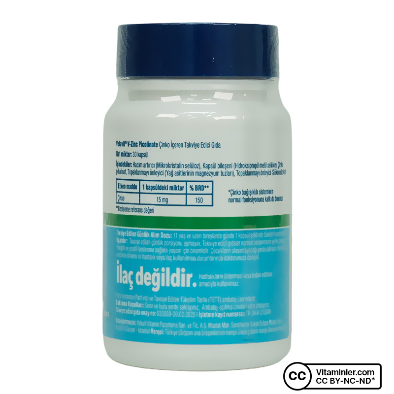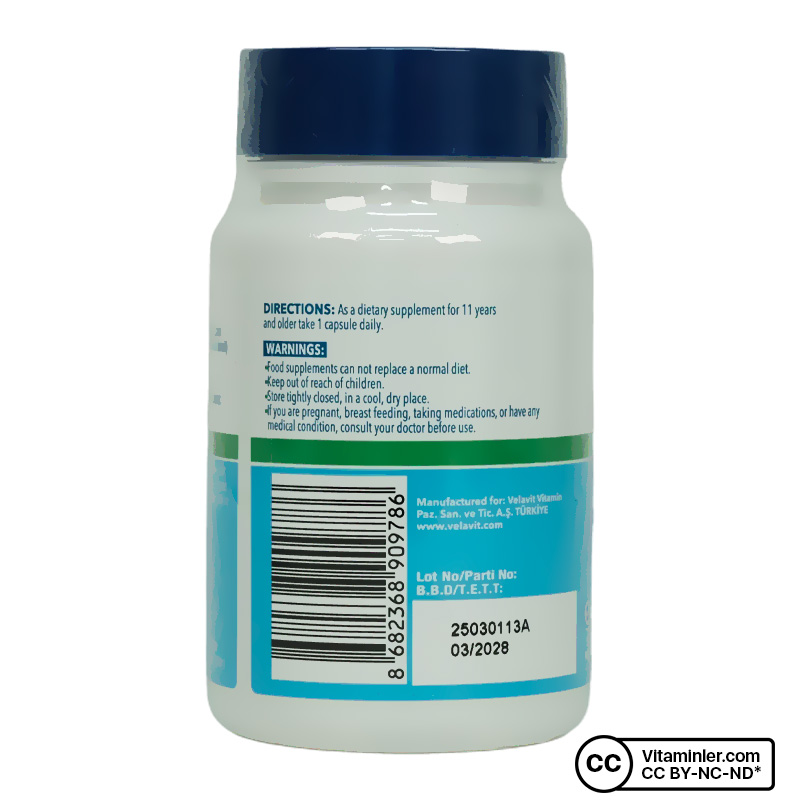 Velavit V-Zinc Picolinate, çinko pikolinat formunu içeren kapsül formatında bir gıda takviyesidir. Ürün, soya, maya, süt ürünleri, şeker ve GDO’lu bileşenler içermeyen formülüyle üretilmiştir. Vegan kullanımına uygun olup 11 yaş ve üzeri bireylerin tüketimine uygundur.