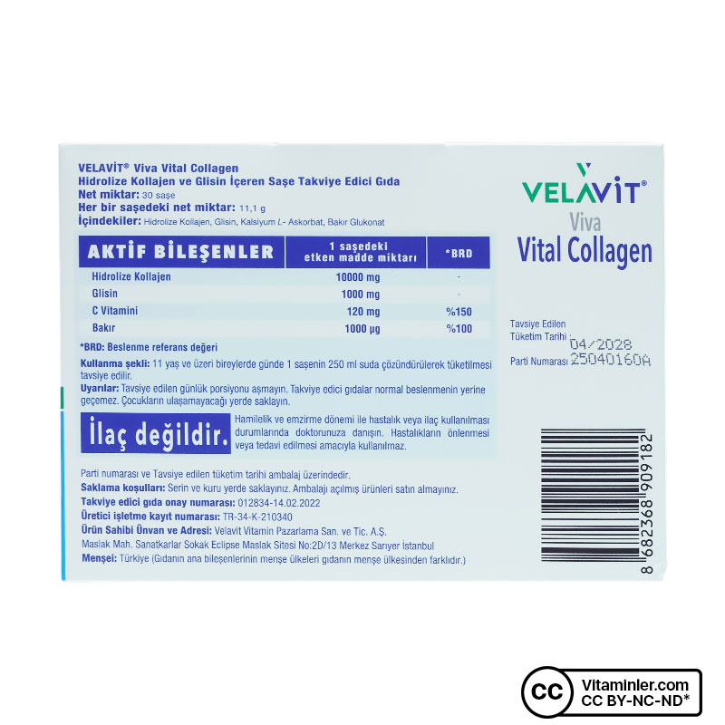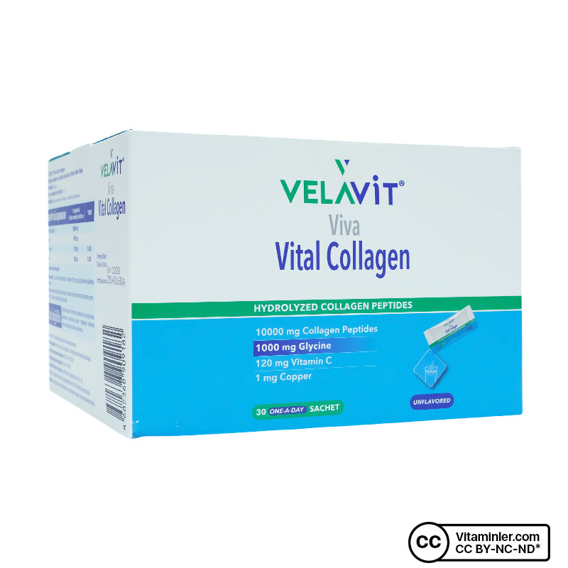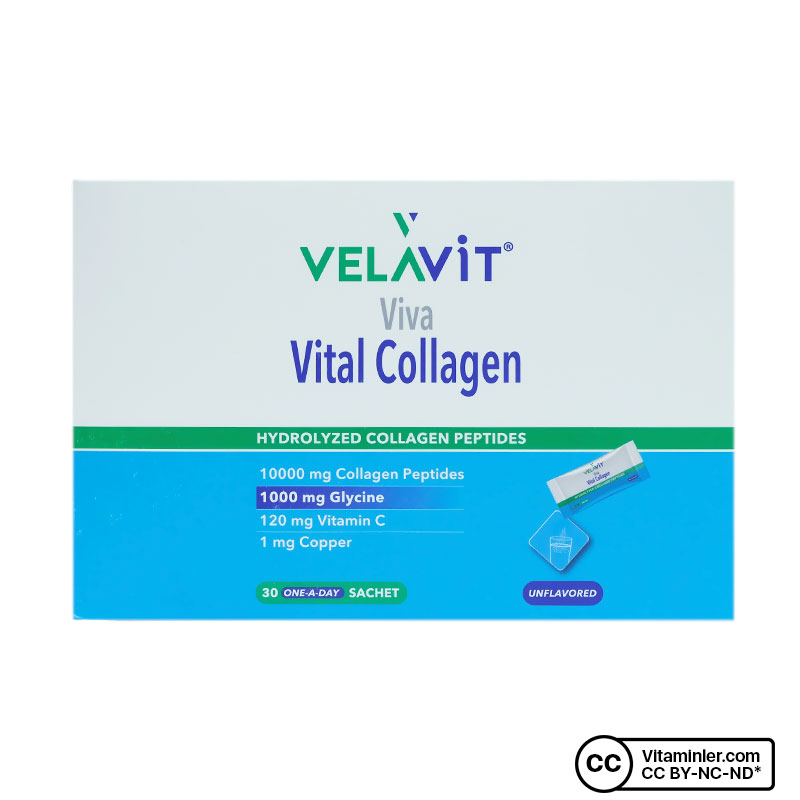 Velavit Viva Vital Collagen 30 Saşe, her saşede 10.000 mg hidrolize kolajen peptitleri ve 1000 mg ekstra glisin içeriğiyle zenginleştirilmiştir. Formülünde ayrıca bakır minerali ve C vitamini bir arada bulunur. Aromasız yapısı sayesinde koku veya tat değişikliği yapmadan farklı içeceklerle kolayca tüketilebilir. İçeriğinde kullanılan kolajen ham maddesi helal ve kosher sertifikalıdır, bu özelliğiyle güvenle tercih edilebilecek bir takviye sunar.