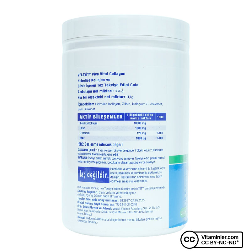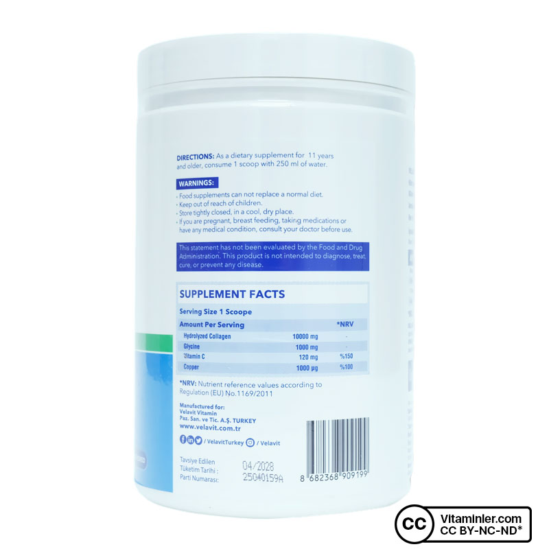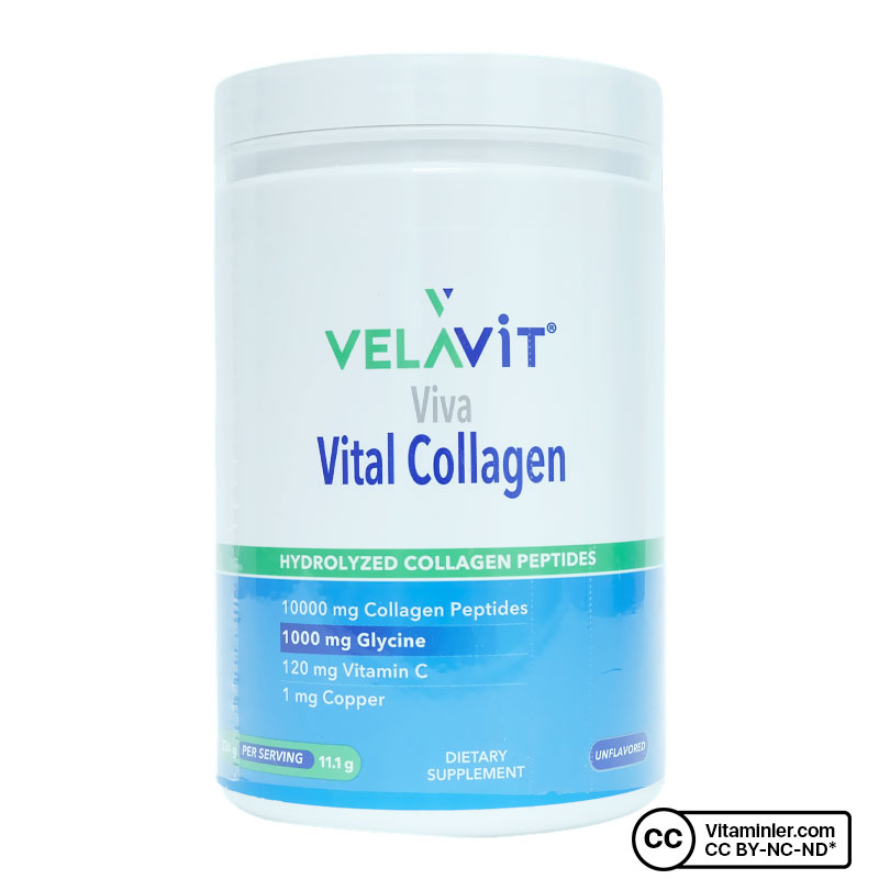 Velavit Viva Vital Collagen 333 Gr, her servisinde 10.000 mg hidrolize kollajen peptitleri ve 1000 mg ekstra glisin içeriğiyle desteklenmiştir. Formülünde bakır minerali ve C vitamini de yer alır. Aromasız yapısı sayesinde koku veya tat değişikliği yapmadan su, kahve ya da farklı içeceklere kolayca karıştırılarak tüketilebilir. Kullanılan kolajen hammaddesi helal ve kosher sertifikalıdır, böylece güvenle tercih edilebilecek bir takviye alternatifi sunar.