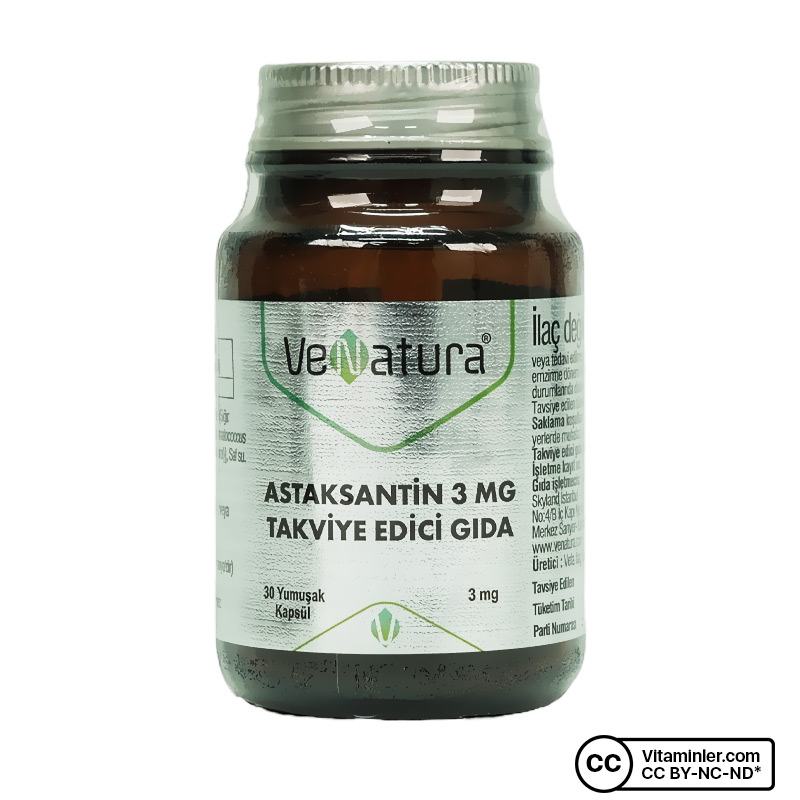 Venatura Astaksantin 3 Mg, antioksidan özellikleriyle bilinen astaksantin içeren takviye edici bir gıdadır. Her kapsülde 3 mg astaksantin bulunur ve kutu içerisinde 30 adet yumuşak kapsül yer alır. Astaksantin; doğada yengeç, karides, ıstakoz ve kerevit gibi kabuklularda, somon balığında, ayrıca flamingo ve kızıl aynak gibi bazı kuşların tüylerinde bulunan, karotenoidler grubuna ait doğal bir pigmenttir.
