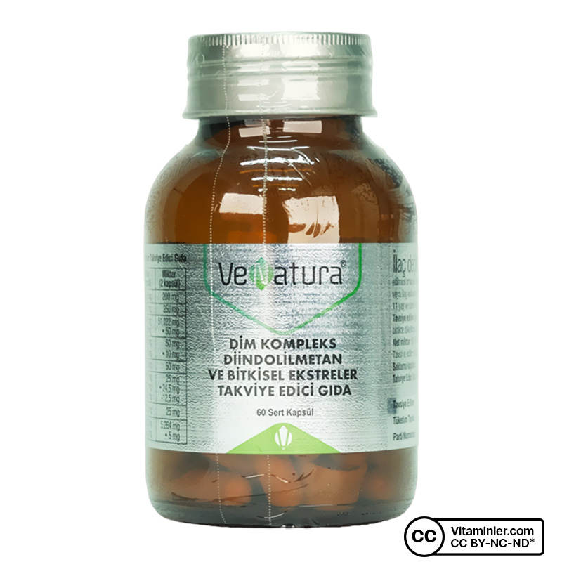 Venatura Dim Kompleks 60 Kapsül; her kapsülde 100 mg Diindolilmetan (DIM) içeren ve 6 farklı bitkisel ekstre ile desteklenmiş bir takviye edici gıdadır. Formülünde DIM’e ek olarak kalsiyum D-glukarat, Japon poligonumu (Polygonum cuspidatum) ekstresi, nar meyve kabuğu ekstresi, brokoli ekstresi, yeşil çay ekstresi, üzüm ekstresi ve karabiber ekstresi yer alır. Bitkisel kapsül formunda sunulan ürün, 60 kapsül içermektedir.