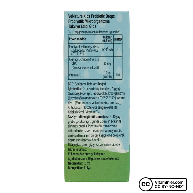 Venatura Kids Probiyotik 15 mL Damla Muz, çocuklar için özel olarak geliştirilmiş, her serviste 1 milyar KOB probiyotik içeren bir takviyedir. Formülü alg yağı ve D3 vitamini ile zenginleştirilmiştir. Damla formu sayesinde kolayca kullanılabilir ve muz aromasıyla çocuklar için lezzetli bir deneyim sunar.
