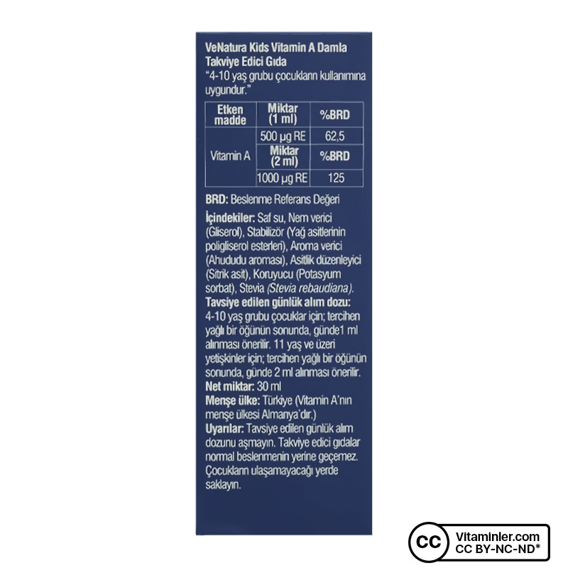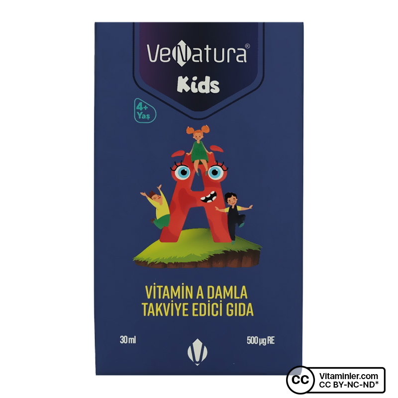 Venatura Kids Vitamin A 30 mL Damla Ahududu, çocukların günlük A vitamini ihtiyacını desteklemek üzere formüle edilmiş bir takviyedir. Her serviste 500 mcg A vitamini içerir. Damla formu sayesinde kolay kullanım imkanı sunarken, ahududu aromasıyla çocukların severek tüketebileceği lezzetli bir deneyim sağlar.