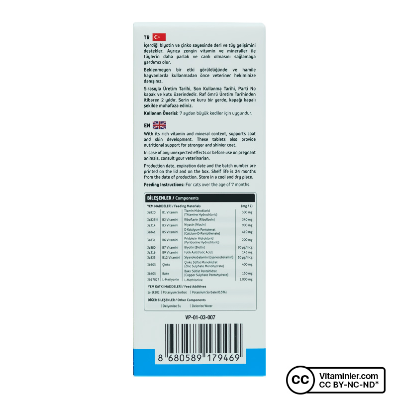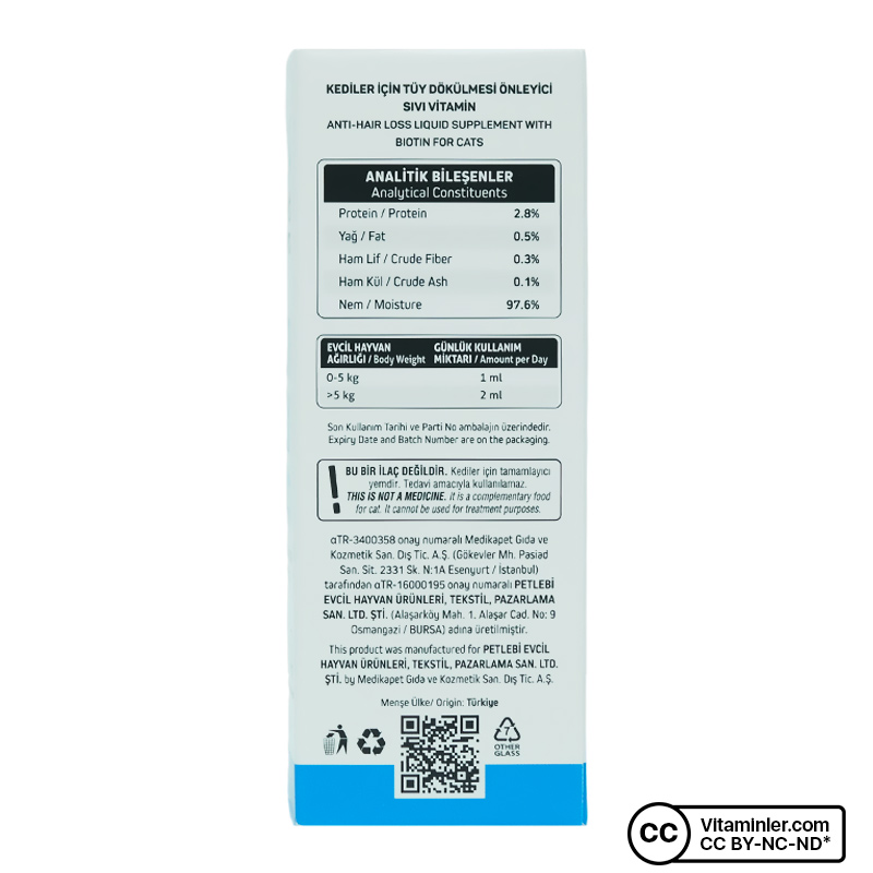 Kedilerde genel tüy ve cilt yapısını destekleyerek tüy dökülmesini azaltmaya yardımcı olmak için özel olarak formüle edilmiş sıvı takviyedir. Kedilerin biotin ve çinko ihtiyacını karşılar. Kedinizin sağlıklı deri ve tüy yapısına sahip olması için gerekli vitamin ve mineralleri içerir. Kuru ve mat tüylere canlılık verir. Derideki kuruluğa ve kaşıntıya karşı cildi nemlendirir, rahatlatır. Deri ve tüy gelişimini destekler. Anti Hair-Loss damlayı şişenin içinde bulunan pipet yardımıyla aşağıdaki dozajlara uygun olarak kedinizin kuru mamasına, yaş mamasına ya da suyuna ekleyebilirsiniz.