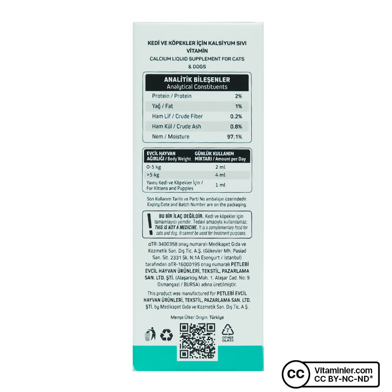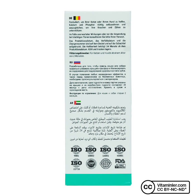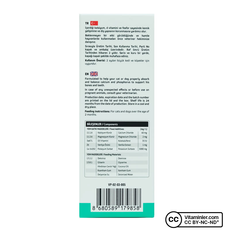 Kedi ve köpeklerde kalsiyum eksikliğini gidermeye destek olmak için formüle edilmiş sıvı takviyedir. İçerdiği kalsiyum, d vitamini ve fosfor sayesinde kemik gelişimine ve diş yapısının korunmasına yardımcı olur. Damlalık aparatı ile kullanım kolaylığı sağlar.