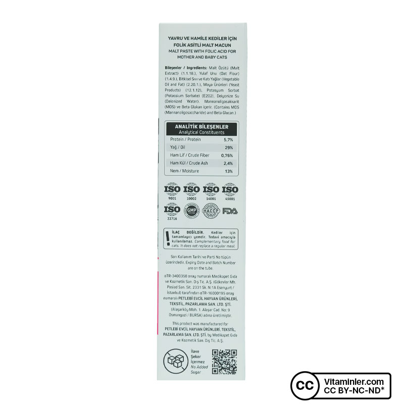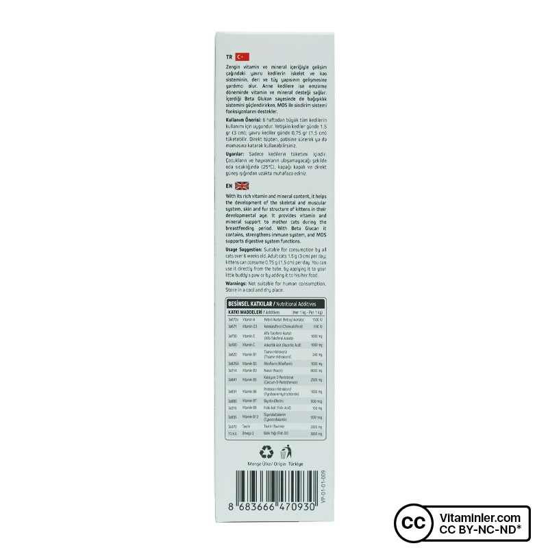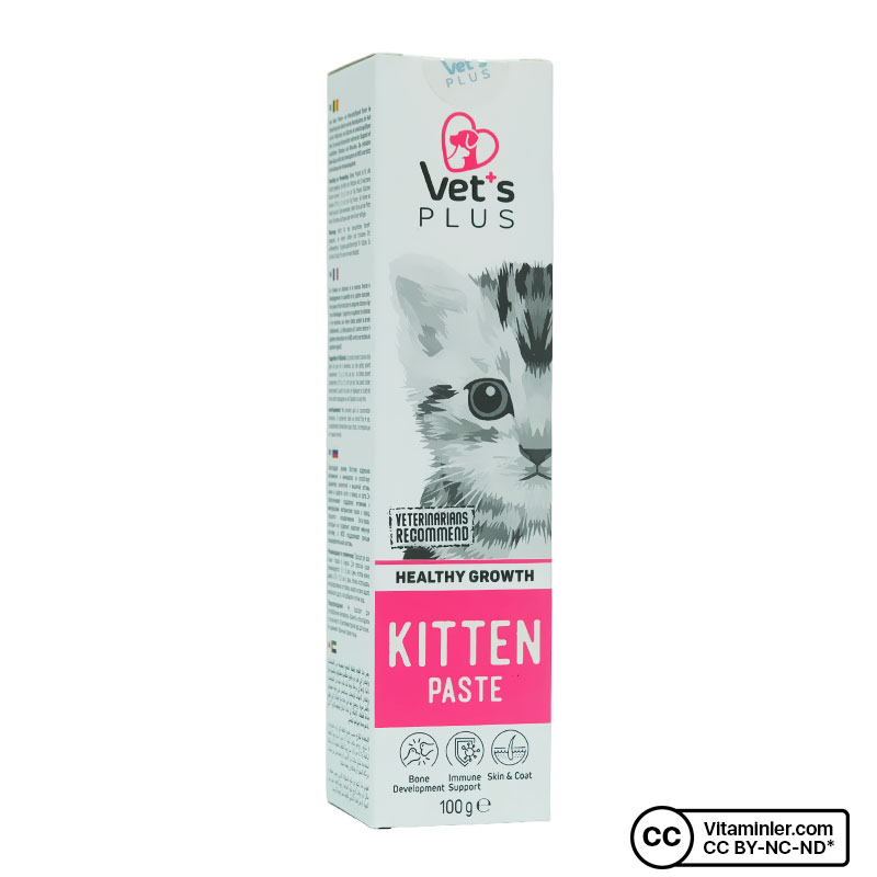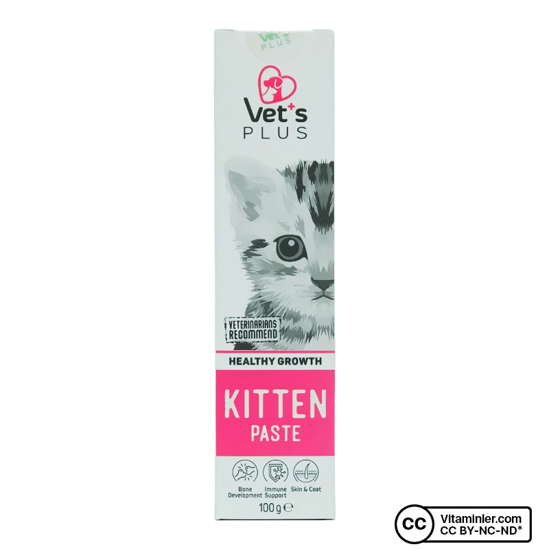 Vet's Plus Kitten Paste, zengin vitamin ve mineral içeriği ile hamile ve yavru kedilerin ihtiyaçları için özenle formüle edilmiştir. Hamile kedi vitamini olarak da bilinen B9, DNA sentezlenmesinde ve hücre çoğalmasında önemli bir role sahiptir. Önemli bir amino asit olan taurin kedilerin vücudunda doğal yollarla sentezlenemez. Dolayısıyla taurinin besinler ya da takviyeler yoluyla mutlak surette vücuda alınması gerekir. Mannan-Oligasakkarit (MOS) içeriği ile sindirim sisteminin düzenli bir şekilde çalışmasını destekler. İçerdiği yüksek kaliteli malt özleri sayesinde kedinizin kendini temizlerken yuttuğu tüyleri ve diğer sindirilemeyen bileşenleri doğal yollarla vücuttan atmasına yardımcı olur. Balık yağında bulunan Omega 3 ve biyotin ile tüylerin daha canlı ve parlak olmasına yardımcı olur.