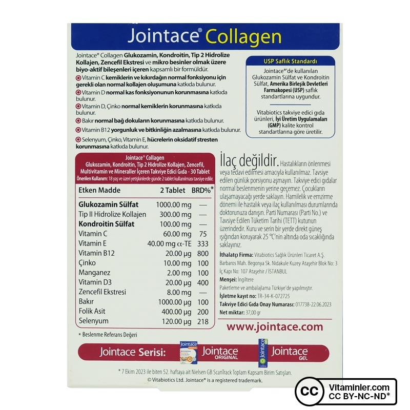 Vitabiotics Jointace Collagen Glukozamin, Kondroitin, Tip II Hidrolize Kollajen, Zencefil Ekstresi ve mikro besinler olmak üzere biyo-aktif bileşenleri içeren kapsamlı bir formüldür. Yapay renklendirici, koruyucu ve laktoz içermez.