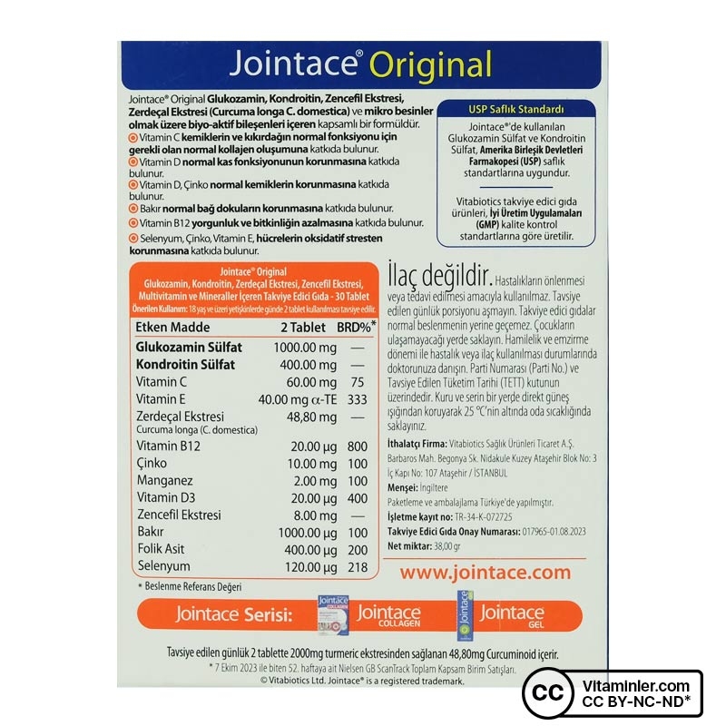 Jointace Original Glukozamin, Kondroitin, Zencefil Ekstresi, Zerdec¸al Ekstresi curcuminoidler ve mikro besinler olmak u¨zere biyo-aktif biles¸enleri içeren kapsamlı bir formüldür. Vitamin ve mineraller ile desteklenmiştir. Yapay renklendirici, koruyucu ve laktoz içermez.